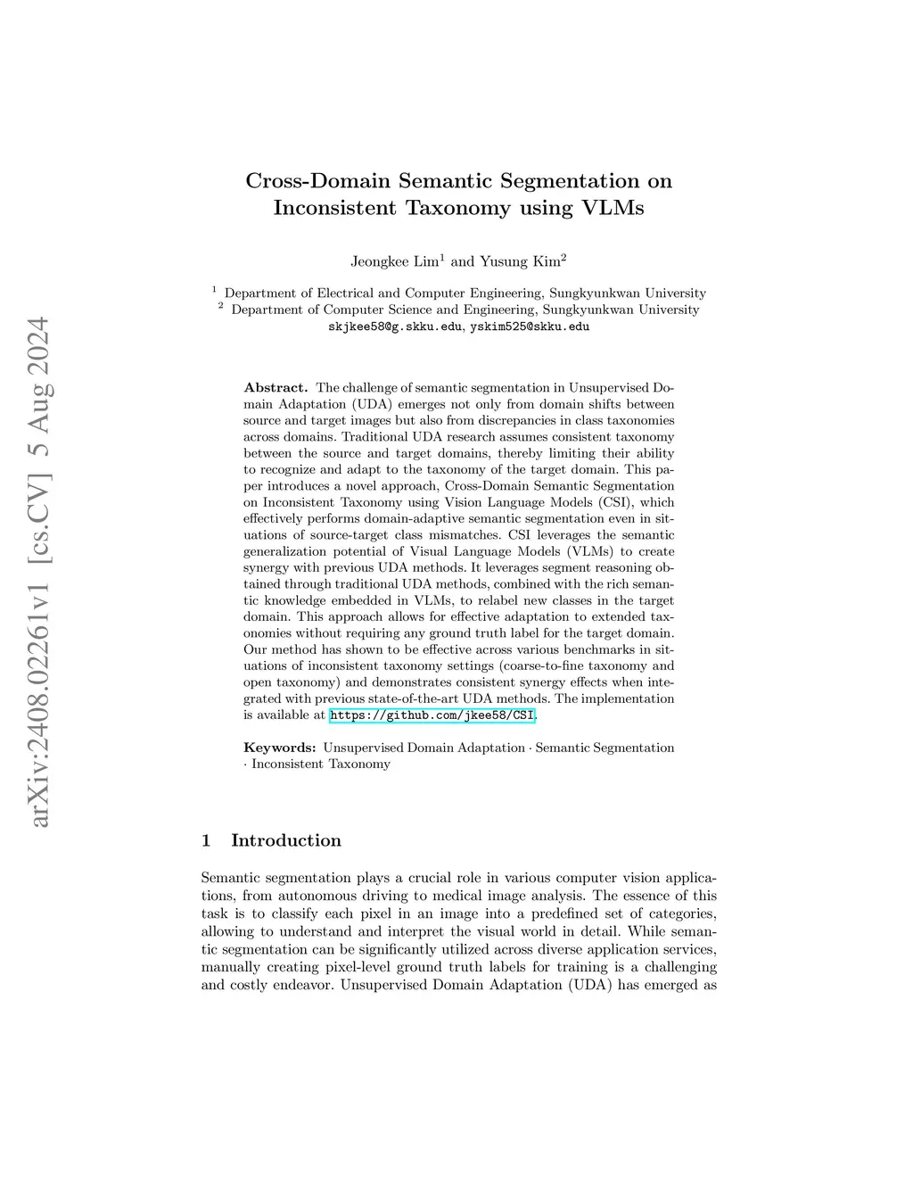The challenge of semantic segmentation in Unsupervised Domain Adaptation (UDA) emerges not only from domain shifts between source and target images but also from discrepancies in class taxonomies across domains. Traditional UDA research assumes consistent taxonomy between the source and target domains, thereby limiting their ability to recognize and adapt to the taxonomy of the target domain. This paper introduces a novel approach, Cross-Domain Semantic Segmentation on Inconsistent Taxonomy using Vision Language Models (CSI), which effectively performs domain-adaptive semantic segmentation even in situations of source-target class mismatches. CSI leverages the semantic generalization potential of Visual Language Models (VLMs) to create synergy with previous UDA methods. It leverages segment reasoning obtained through traditional UDA methods, combined with the rich semantic knowledge embedded in VLMs, to relabel new classes in the target domain. This approach allows for effective adaptation to extended taxonomies without requiring any ground truth label for the target domain. Our method has shown to be effective across various benchmarks in situations of inconsistent taxonomy settings (coarse-to-fine taxonomy and open taxonomy) and demonstrates consistent synergy effects when integrated with previous state-of-the-art UDA methods. The implementation is available at http://github.com/jkee58/CSI.