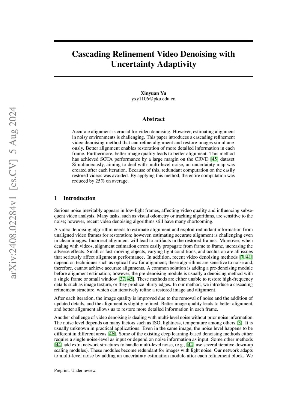 Accurate alignment is crucial for video denoising. However, estimating alignment in noisy environments is challenging. This paper introduces a cascading refinement video denoising method that can refine alignment and restore images simultaneously. Better alignment enables restoration of more detailed information in each frame. Furthermore, better image quality leads to better alignment. This method has achieved SOTA performance by a large margin on the CRVD dataset. Simultaneously, aiming to deal with multi-level noise, an uncertainty map was created after each iteration. Because of this, redundant computation on the easily restored videos was avoided. By applying this method, the entire computation was reduced by 25% on average.