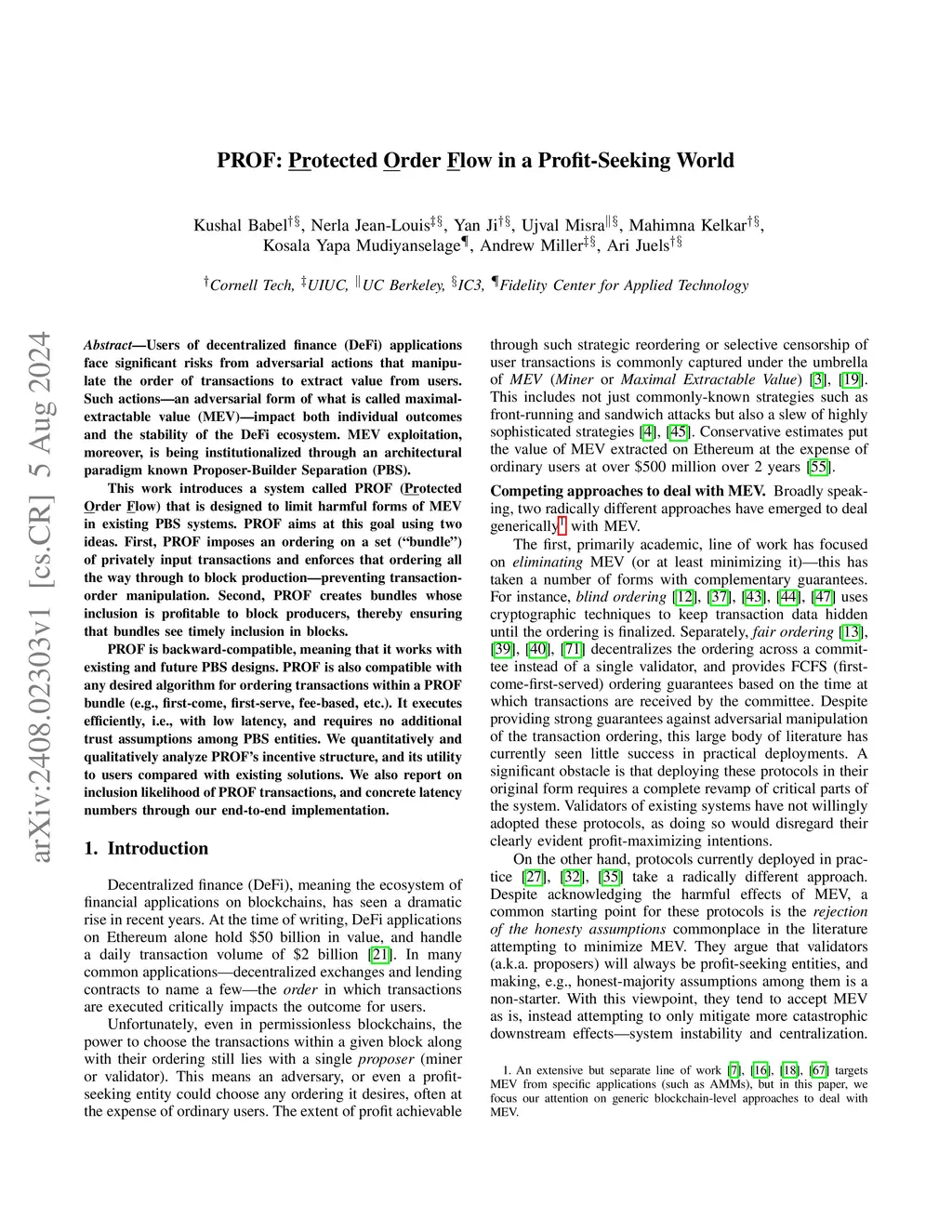 Users of decentralized finance (DeFi) applications face significant risks from adversarial actions that manipulate the order of transactions to extract value from users. Such actions -- an adversarial form of what is called maximal-extractable value (MEV) -- impact both individual outcomes and the stability of the DeFi ecosystem. MEV exploitation, moreover, is being institutionalized through an architectural paradigm known Proposer-Builder Separation (PBS). This work introduces a system called PROF (PRotected Order Flow) that is designed to limit harmful forms of MEV in existing PBS systems. PROF aims at this goal using two ideas. First, PROF imposes an ordering on a set ("bundle") of privately input transactions and enforces that ordering all the way through to block production -- preventing transaction-order manipulation. Second, PROF creates bundles whose inclusion is profitable to block producers, thereby ensuring that bundles see timely inclusion in blocks. PROF is backward-compatible, meaning that it works with existing and future PBS designs. PROF is also compatible with any desired algorithm for ordering transactions within a PROF bundle (e.g., first-come, first-serve, fee-based, etc.). It executes efficiently, i.e., with low latency, and requires no additional trust assumptions among PBS entities. We quantitatively and qualitatively analyze incentive structure of PROF, and its utility to users compared with existing solutions. We also report on inclusion likelihood of PROF transactions, and concrete latency numbers through our end-to-end implementation.