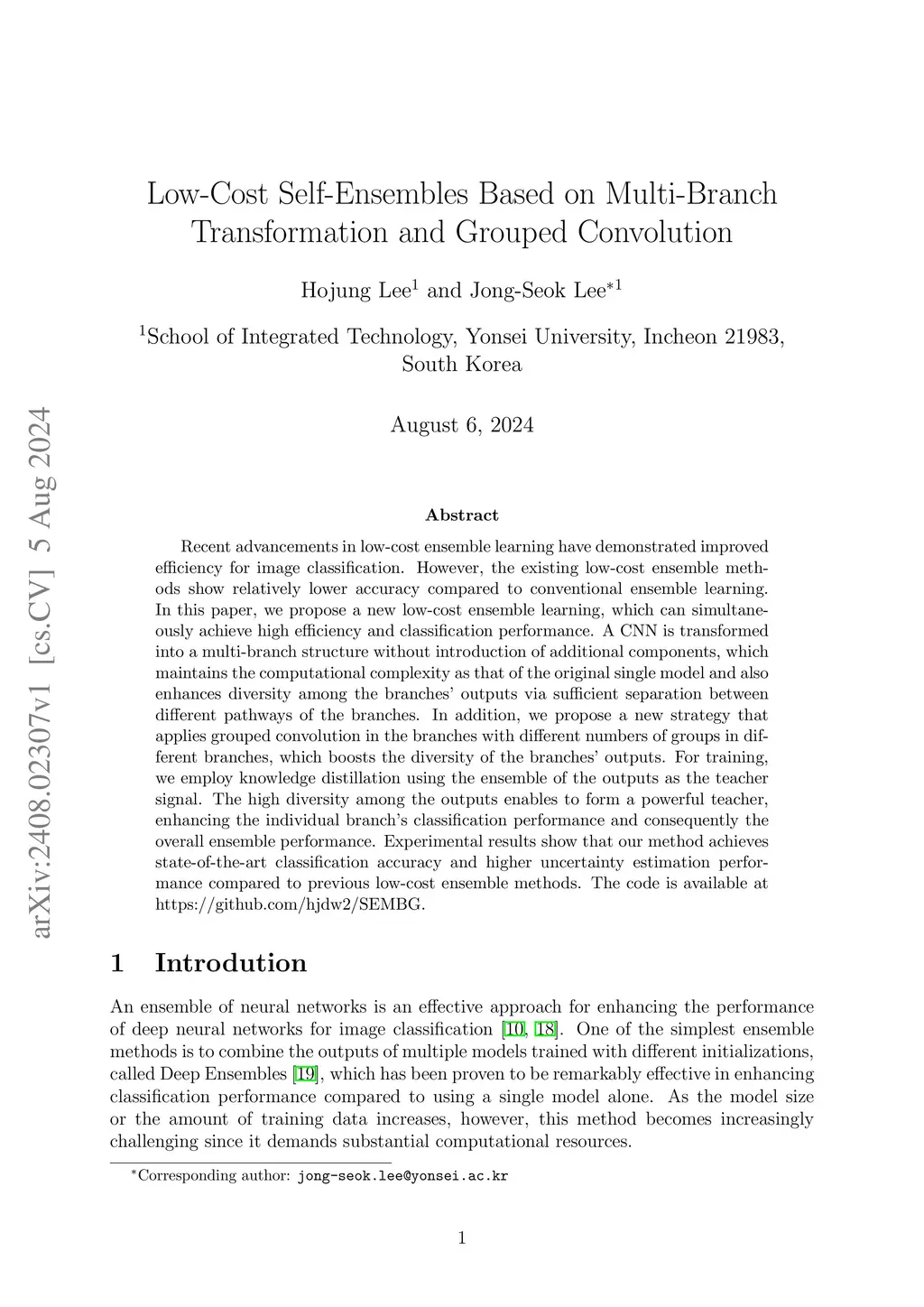 Recent advancements in low-cost ensemble learning have demonstrated improved efficiency for image classification. However, the existing low-cost ensemble methods show relatively lower accuracy compared to conventional ensemble learning. In this paper, we propose a new low-cost ensemble learning, which can simultaneously achieve high efficiency and classification performance. A CNN is transformed into a multi-branch structure without introduction of additional components, which maintains the computational complexity as that of the original single model and also enhances diversity among the branches' outputs via sufficient separation between different pathways of the branches. In addition, we propose a new strategy that applies grouped convolution in the branches with different numbers of groups in different branches, which boosts the diversity of the branches' outputs. For training, we employ knowledge distillation using the ensemble of the outputs as the teacher signal. The high diversity among the outputs enables to form a powerful teacher, enhancing the individual branch's classification performance and consequently the overall ensemble performance. Experimental results show that our method achieves state-of-the-art classification accuracy and higher uncertainty estimation performance compared to previous low-cost ensemble methods. The code is available at https://github.com/hjdw2/SEMBG.