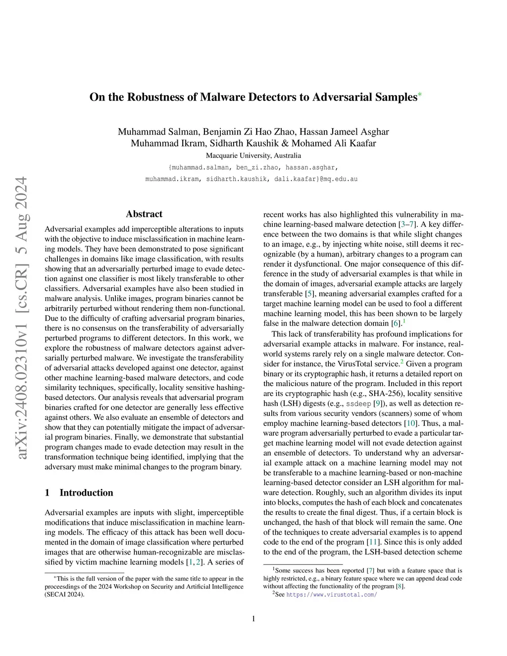 Adversarial examples add imperceptible alterations to inputs with the objective to induce misclassification in machine learning models. They have been demonstrated to pose significant challenges in domains like image classification, with results showing that an adversarially perturbed image to evade detection against one classifier is most likely transferable to other classifiers. Adversarial examples have also been studied in malware analysis. Unlike images, program binaries cannot be arbitrarily perturbed without rendering them non-functional. Due to the difficulty of crafting adversarial program binaries, there is no consensus on the transferability of adversarially perturbed programs to different detectors. In this work, we explore the robustness of malware detectors against adversarially perturbed malware. We investigate the transferability of adversarial attacks developed against one detector, against other machine learning-based malware detectors, and code similarity techniques, specifically, locality sensitive hashing-based detectors. Our analysis reveals that adversarial program binaries crafted for one detector are generally less effective against others. We also evaluate an ensemble of detectors and show that they can potentially mitigate the impact of adversarial program binaries. Finally, we demonstrate that substantial program changes made to evade detection may result in the transformation technique being identified, implying that the adversary must make minimal changes to the program binary.