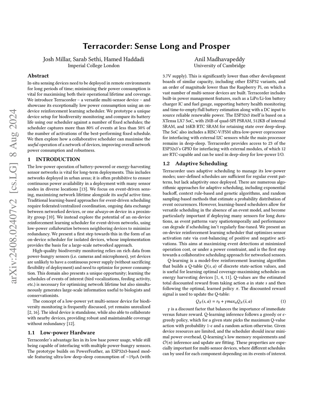 In-situ sensing devices need to be deployed in remote environments for long periods of time; minimizing their power consumption is vital for maximising both their operational lifetime and coverage. We introduce Terracorder -- a versatile multi-sensor device -- and showcase its exceptionally low power consumption using an on-device reinforcement learning scheduler. We prototype a unique device setup for biodiversity monitoring and compare its battery life using our scheduler against a number of fixed schedules; the scheduler captures more than 80% of events at less than 50% of the number of activations of the best-performing fixed schedule. We then explore how a collaborative scheduler can maximise the useful operation of a network of devices, improving overall network power consumption and robustness.