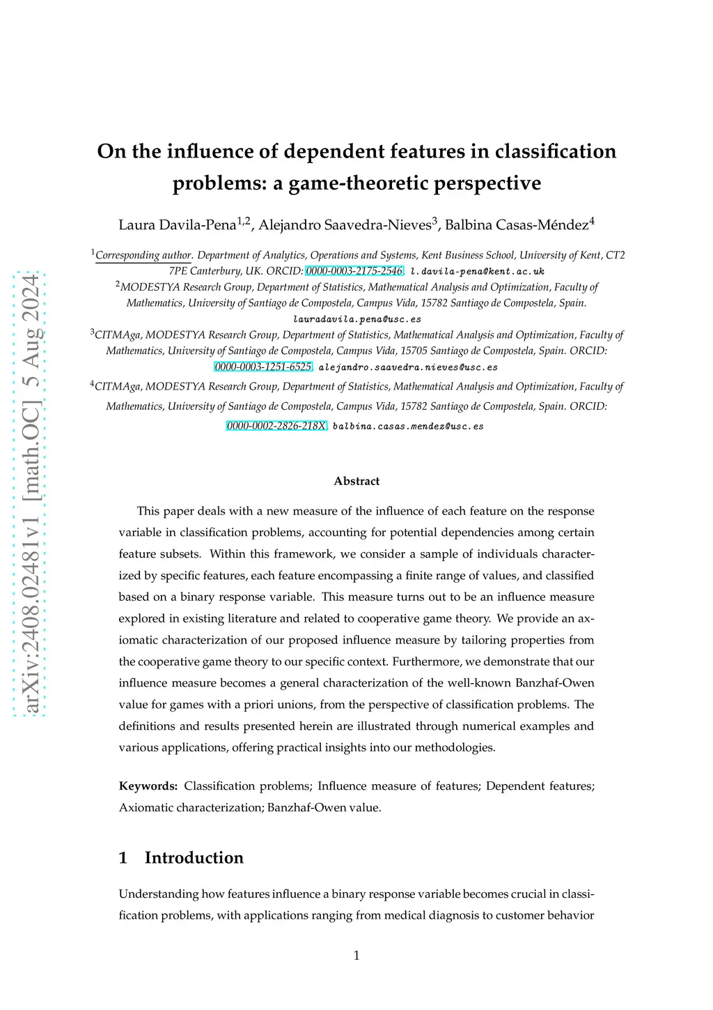 This paper deals with a new measure of the influence of each feature on the response variable in classification problems, accounting for potential dependencies among certain feature subsets. Within this framework, we consider a sample of individuals characterized by specific features, each feature encompassing a finite range of values, and classified based on a binary response variable. This measure turns out to be an influence measure explored in existing literature and related to cooperative game theory. We provide an axiomatic characterization of our proposed influence measure by tailoring properties from the cooperative game theory to our specific context. Furthermore, we demonstrate that our influence measure becomes a general characterization of the well-known Banzhaf-Owen value for games with a priori unions, from the perspective of classification problems. The definitions and results presented herein are illustrated through numerical examples and various applications, offering practical insights into our methodologies.