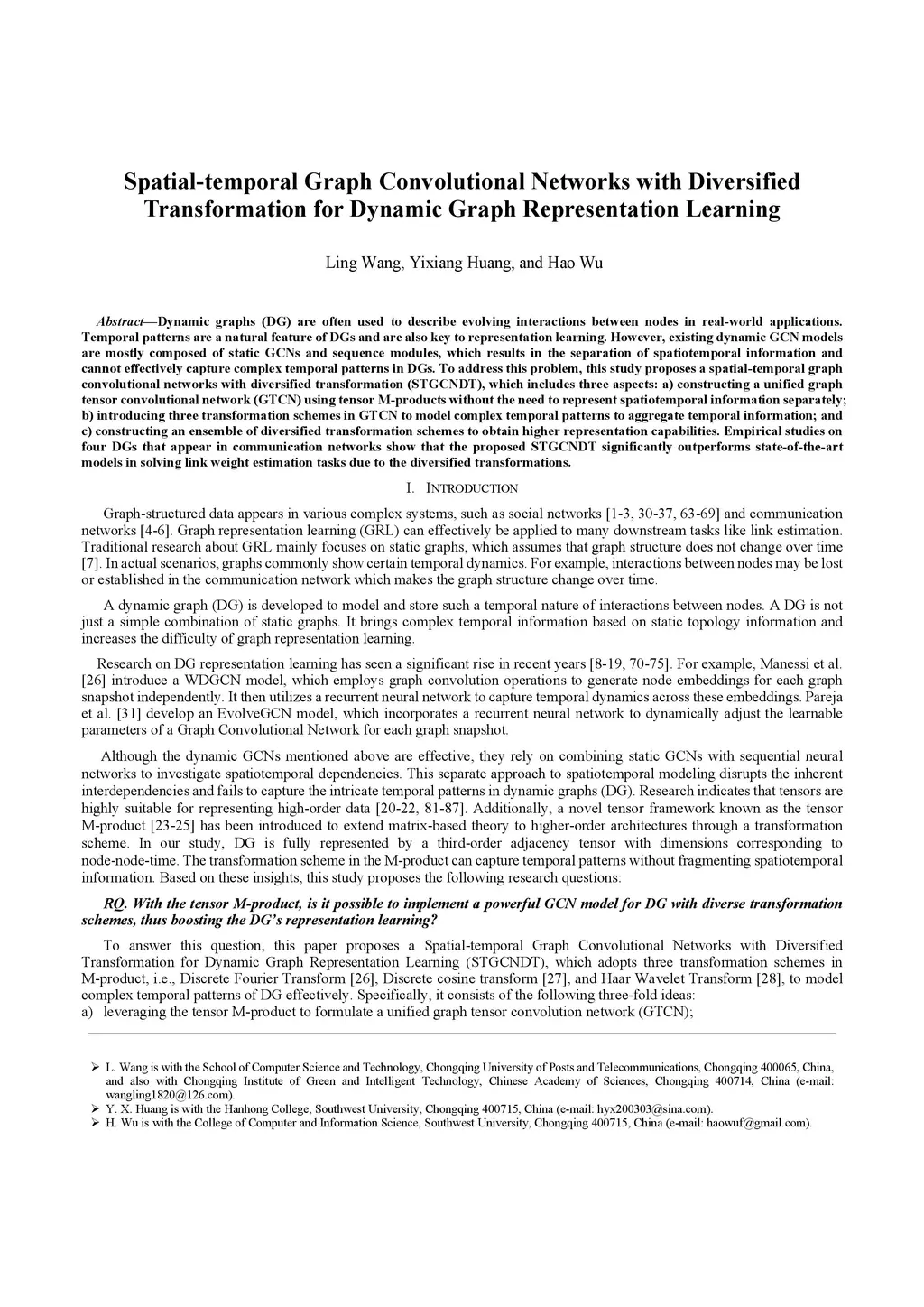 Dynamic graphs (DG) are often used to describe evolving interactions between nodes in real-world applications. Temporal patterns are a natural feature of DGs and are also key to representation learning. However, existing dynamic GCN models are mostly composed of static GCNs and sequence modules, which results in the separation of spatiotemporal information and cannot effectively capture complex temporal patterns in DGs. To address this problem, this study proposes a spatial-temporal graph convolutional networks with diversified transformation (STGCNDT), which includes three aspects: a) constructing a unified graph tensor convolutional network (GTCN) using tensor M-products without the need to represent spatiotemporal information separately; b) introducing three transformation schemes in GTCN to model complex temporal patterns to aggregate temporal information; and c) constructing an ensemble of diversified transformation schemes to obtain higher representation capabilities. Empirical studies on four DGs that appear in communication networks show that the proposed STGCNDT significantly outperforms state-of-the-art models in solving link weight estimation tasks due to the diversified transformations.