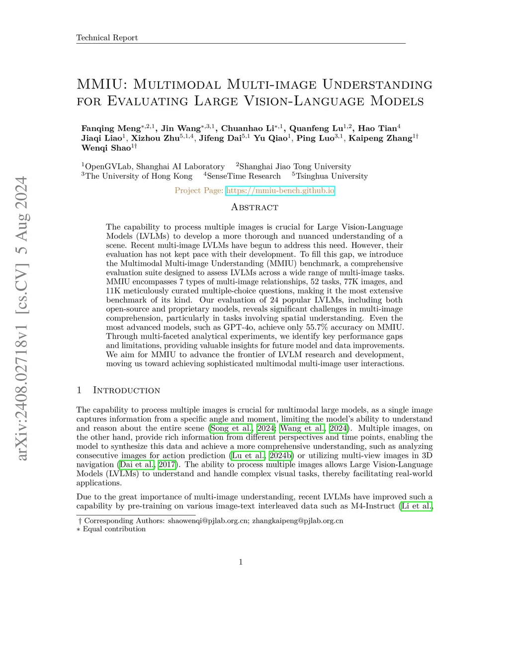 The capability to process multiple images is crucial for Large Vision-Language Models (LVLMs) to develop a more thorough and nuanced understanding of a scene. Recent multi-image LVLMs have begun to address this need. However, their evaluation has not kept pace with their development. To fill this gap, we introduce the Multimodal Multi-image Understanding (MMIU) benchmark, a comprehensive evaluation suite designed to assess LVLMs across a wide range of multi-image tasks. MMIU encompasses 7 types of multi-image relationships, 52 tasks, 77K images, and 11K meticulously curated multiple-choice questions, making it the most extensive benchmark of its kind. Our evaluation of 24 popular LVLMs, including both open-source and proprietary models, reveals significant challenges in multi-image comprehension, particularly in tasks involving spatial understanding. Even the most advanced models, such as GPT-4o, achieve only 55.7% accuracy on MMIU. Through multi-faceted analytical experiments, we identify key performance gaps and limitations, providing valuable insights for future model and data improvements. We aim for MMIU to advance the frontier of LVLM research and development, moving us toward achieving sophisticated multimodal multi-image user interactions.