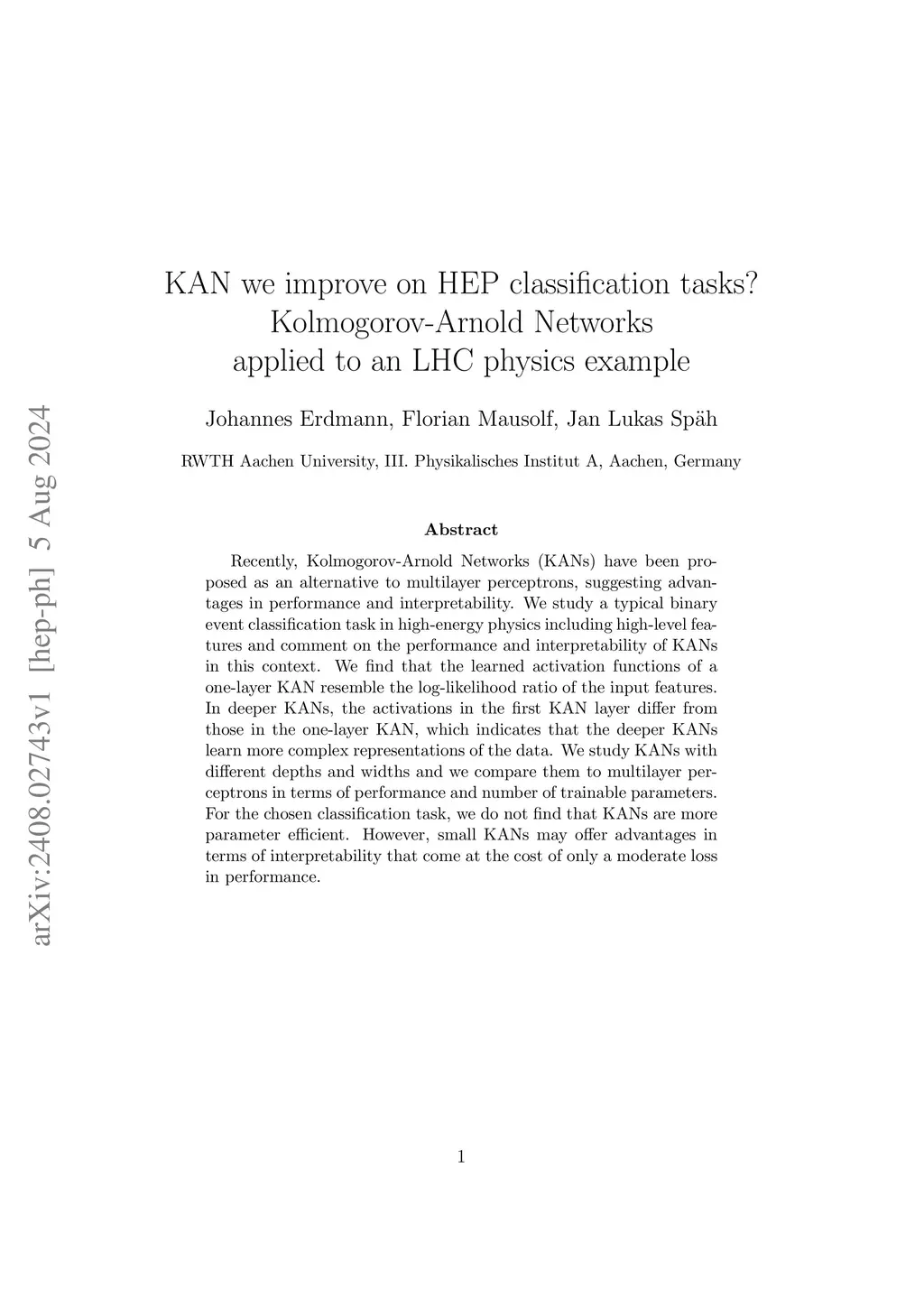 Recently, Kolmogorov-Arnold Networks (KANs) have been proposed as an alternative to multilayer perceptrons, suggesting advantages in performance and interpretability. We study a typical binary event classification task in high-energy physics including high-level features and comment on the performance and interpretability of KANs in this context. Consistent with expectations, we find that the learned activation functions of a one-layer KAN resemble the univariate log-likelihood ratios of the respective input features. In deeper KANs, the activations in the first layer differ from those in the one-layer KAN, which indicates that the deeper KANs learn more complex representations of the data, a pattern commonly observed in other deep-learning architectures. We study KANs with different depths and widths and we compare them to multilayer perceptrons in terms of performance and number of trainable parameters. For the chosen classification task, we do not find that KANs are more parameter efficient. However, small KANs may offer advantages in terms of interpretability that come at the cost of only a moderate loss in performance.