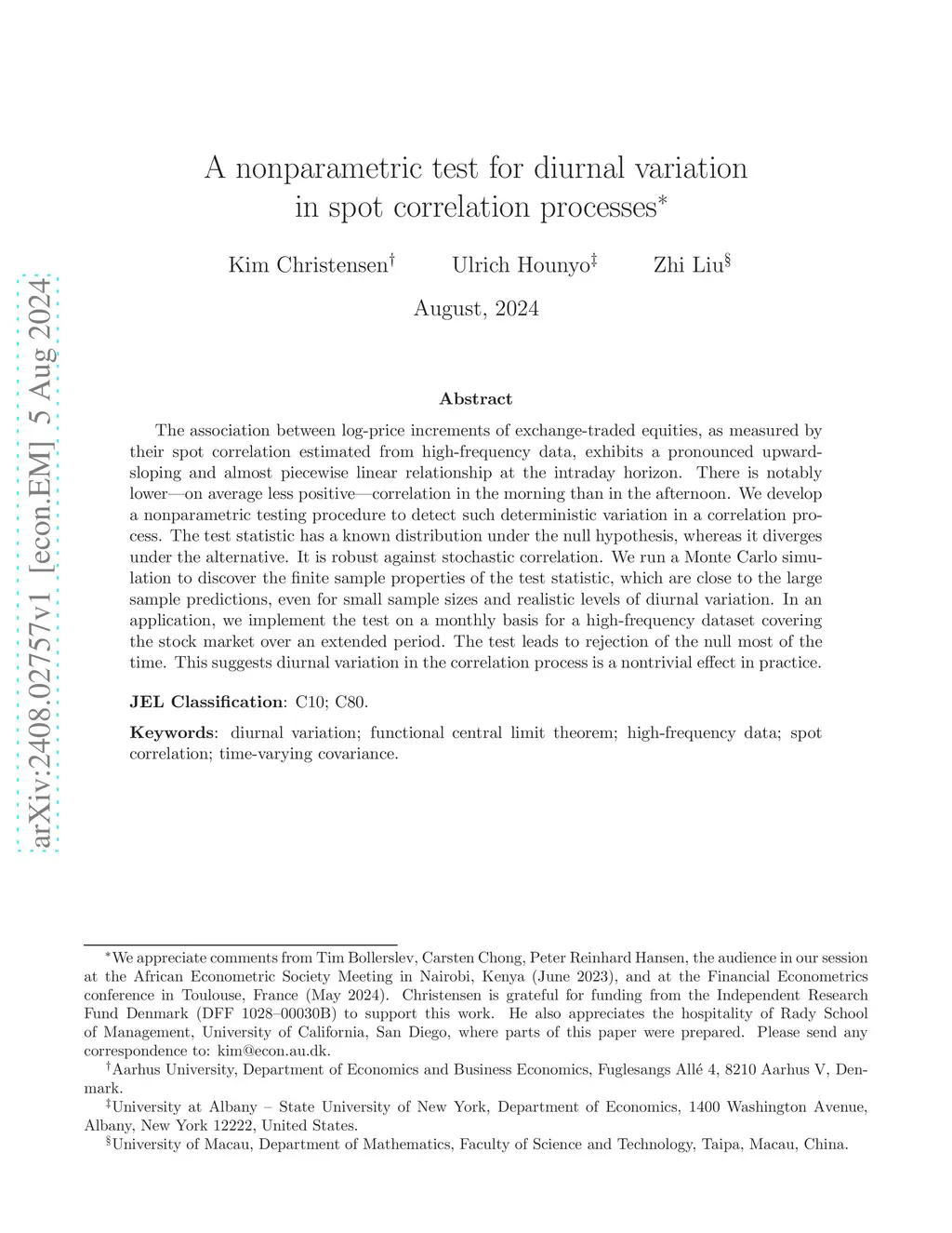 The association between log-price increments of exchange-traded equities, as measured by their spot correlation estimated from high-frequency data, exhibits a pronounced upward-sloping and almost piecewise linear relationship at the intraday horizon. There is notably lower-on average less positive-correlation in the morning than in the afternoon. We develop a nonparametric testing procedure to detect such deterministic variation in a correlation process. The test statistic has a known distribution under the null hypothesis, whereas it diverges under the alternative. It is robust against stochastic correlation. We run a Monte Carlo simulation to discover the finite sample properties of the test statistic, which are close to the large sample predictions, even for small sample sizes and realistic levels of diurnal variation. In an application, we implement the test on a monthly basis for a high-frequency dataset covering the stock market over an extended period. The test leads to rejection of the null most of the time. This suggests diurnal variation in the correlation process is a nontrivial effect in practice.
