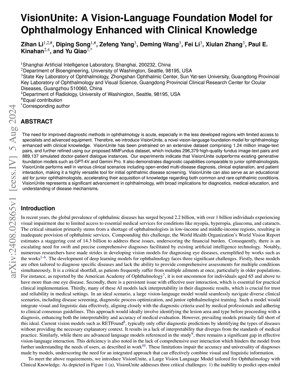 The need for improved diagnostic methods in ophthalmology is acute, especially in the underdeveloped regions with limited access to specialists and advanced equipment. Therefore, we introduce VisionUnite, a novel vision-language foundation model for ophthalmology enhanced with clinical knowledge. VisionUnite has been pretrained on an extensive dataset comprising 1.24 million image-text pairs, and further refined using our proposed MMFundus dataset, which includes 296,379 high-quality fundus image-text pairs and 889,137 simulated doctor-patient dialogue instances. Our experiments indicate that VisionUnite outperforms existing generative foundation models such as GPT-4V and Gemini Pro. It also demonstrates diagnostic capabilities comparable to junior ophthalmologists. VisionUnite performs well in various clinical scenarios including open-ended multi-disease diagnosis, clinical explanation, and patient interaction, making it a highly versatile tool for initial ophthalmic disease screening. VisionUnite can also serve as an educational aid for junior ophthalmologists, accelerating their acquisition of knowledge regarding both common and underrepresented ophthalmic conditions. VisionUnite represents a significant advancement in ophthalmology, with broad implications for diagnostics, medical education, and understanding of disease mechanisms. The source code is atthis https URL.