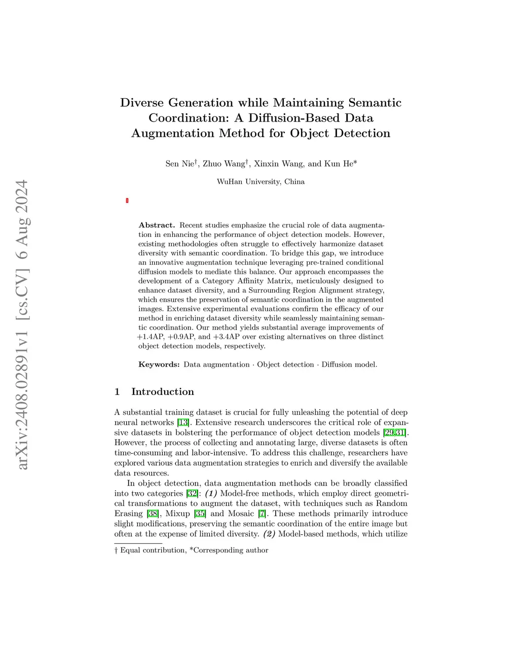 Recent studies emphasize the crucial role of data augmentation in enhancing the performance of object detection models. However,existing methodologies often struggle to effectively harmonize dataset diversity with semantic coordination.To bridge this gap, we introduce an innovative augmentation technique leveraging pre-trained conditional diffusion models to mediate this balance. Our approach encompasses the development of a Category Affinity Matrix, meticulously designed to enhance dataset diversity, and a Surrounding Region Alignment strategy, which ensures the preservation of semantic coordination in the augmented images. Extensive experimental evaluations confirm the efficacy of our method in enriching dataset diversity while seamlessly maintaining semantic coordination. Our method yields substantial average improvements of +1.4AP, +0.9AP, and +3.4AP over existing alternatives on three distinct object detection models, respectively.
