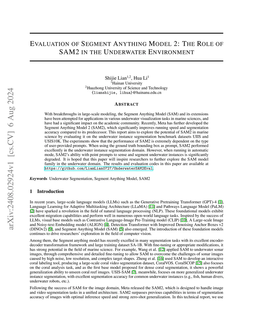 With breakthroughs in large-scale modeling, the Segment Anything Model (SAM) and its extensions have been attempted for applications in various underwater visualization tasks in marine sciences, and have had a significant impact on the academic community. Recently, Meta has further developed the Segment Anything Model 2 (SAM2), which significantly improves running speed and segmentation accuracy compared to its predecessor. This report aims to explore the potential of SAM2 in marine science by evaluating it on the underwater instance segmentation benchmark datasets UIIS and USIS10K. The experiments show that the performance of SAM2 is extremely dependent on the type of user-provided prompts. When using the ground truth bounding box as prompt, SAM2 performed excellently in the underwater instance segmentation domain. However, when running in automatic mode, SAM2's ability with point prompts to sense and segment underwater instances is significantly degraded. It is hoped that this paper will inspire researchers to further explore the SAM model family in the underwater domain. The results and evaluation codes in this paper are available at https://github.com/LiamLian0727/UnderwaterSAM2Eval.