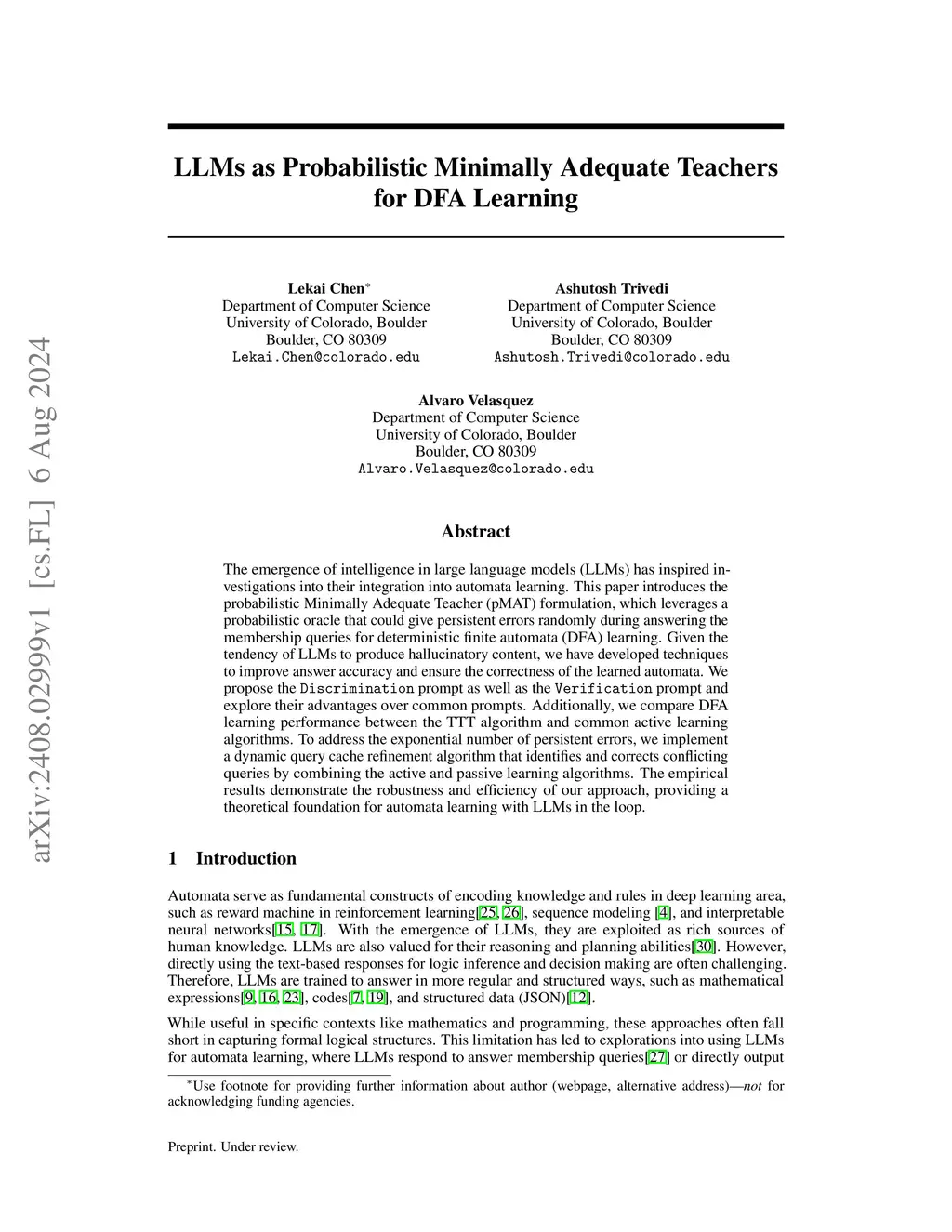 The emergence of intelligence in large language models (LLMs) has inspired investigations into their integration into automata learning. This paper introduces the probabilistic Minimally Adequate Teacher (pMAT) formulation, which leverages a probabilistic oracle that could give persistent errors randomly during answering the membership queries for deterministic finite automata (DFA) learning. Given the tendency of LLMs to produce hallucinatory content, we have developed techniques to improve answer accuracy and ensure the correctness of the learned automata. We propose the prompt as well as the prompt and explore their advantages over common prompts. Additionally, we compare DFA learning performance between the TTT algorithm and common active learning algorithms. To address the exponential number of persistent errors, we implement a dynamic query cache refinement algorithm that identifies and corrects conflicting queries by combining the active and passive learning algorithms. The empirical results demonstrate the robustness and efficiency of our approach, providing a theoretical foundation for automata learning with LLMs in the loop.