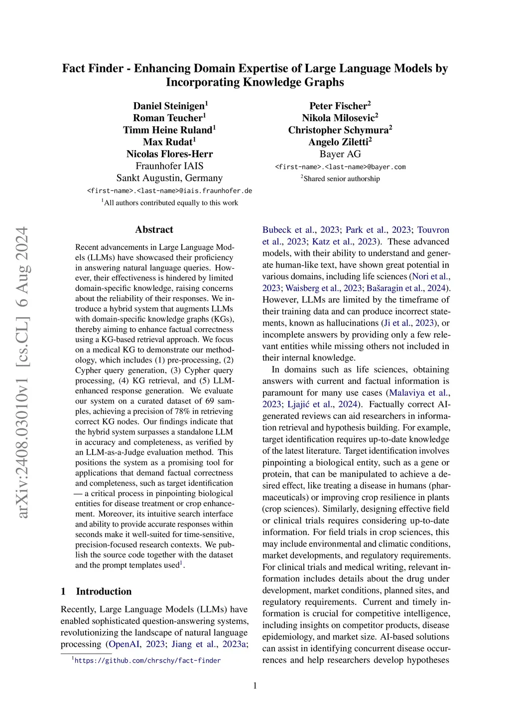 Recent advancements in Large Language Models (LLMs) have showcased their proficiency in answering natural language queries. However, their effectiveness is hindered by limited domain-specific knowledge, raising concerns about the reliability of their responses. We introduce a hybrid system that augments LLMs with domain-specific knowledge graphs (KGs), thereby aiming to enhance factual correctness using a KG-based retrieval approach. We focus on a medical KG to demonstrate our methodology, which includes (1) pre-processing, (2) Cypher query generation, (3) Cypher query processing, (4) KG retrieval, and (5) LLM-enhanced response generation. We evaluate our system on a curated dataset of 69 samples, achieving a precision of 78\% in retrieving correct KG nodes. Our findings indicate that the hybrid system surpasses a standalone LLM in accuracy and completeness, as verified by an LLM-as-a-Judge evaluation method. This positions the system as a promising tool for applications that demand factual correctness and completeness, such as target identification -- a critical process in pinpointing biological entities for disease treatment or crop enhancement. Moreover, its intuitive search interface and ability to provide accurate responses within seconds make it well-suited for time-sensitive, precision-focused research contexts. We publish the source code together with the dataset and the prompt templates used.