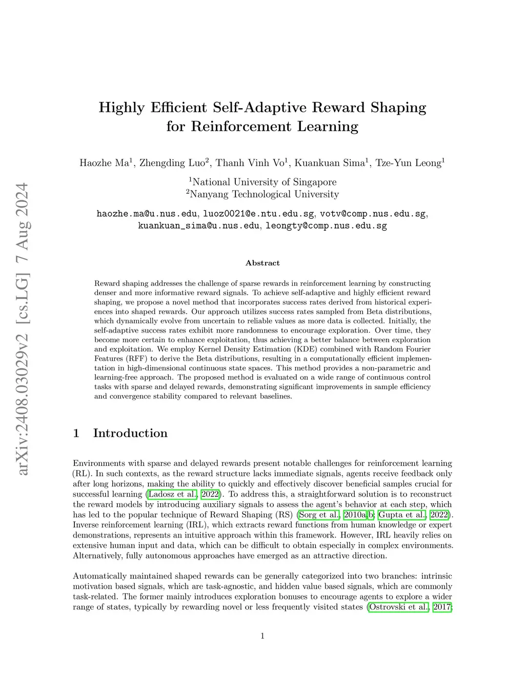 Reward shaping is a technique in reinforcement learning that addresses the sparse-reward problem by providing more frequent and informative rewards. We introduce a self-adaptive and highly efficient reward shaping mechanism that incorporates success rates derived from historical experiences as shaped rewards. The success rates are sampled from Beta distributions, which dynamically evolve from uncertain to reliable values as data accumulates. Initially, the shaped rewards exhibit more randomness to encourage exploration, while over time, the increasing certainty enhances exploitation, naturally balancing exploration and exploitation. Our approach employs Kernel Density Estimation (KDE) combined with Random Fourier Features (RFF) to derive the Beta distributions, providing a computationally efficient, non-parametric, and learning-free solution for high-dimensional continuous state spaces. Our method is validated on various tasks with extremely sparse rewards, demonstrating notable improvements in sample efficiency and convergence stability over relevant baselines.