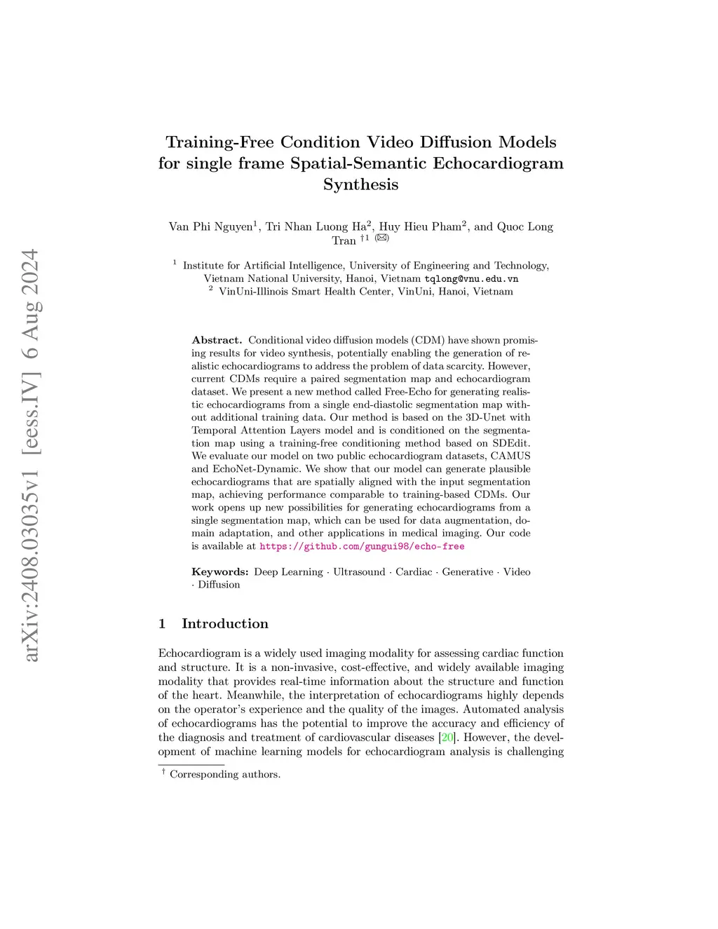 Conditional video diffusion models (CDM) have shown promising results for video synthesis, potentially enabling the generation of realistic echocardiograms to address the problem of data scarcity. However, current CDMs require a paired segmentation map and echocardiogram dataset. We present a new method called Free-Echo for generating realistic echocardiograms from a single end-diastolic segmentation map without additional training data. Our method is based on the 3D-Unet with Temporal Attention Layers model and is conditioned on the segmentation map using a training-free conditioning method based on SDEdit. We evaluate our model on two public echocardiogram datasets, CAMUS and EchoNet-Dynamic. We show that our model can generate plausible echocardiograms that are spatially aligned with the input segmentation map, achieving performance comparable to training-based CDMs. Our work opens up new possibilities for generating echocardiograms from a single segmentation map, which can be used for data augmentation, domain adaptation, and other applications in medical imaging. Our code is available at \url{https://github.com/gungui98/echo-free}