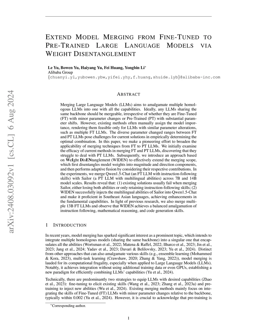 Merging Large Language Models (LLMs) aims to amalgamate multiple homologous LLMs into one with all the capabilities. Ideally, any LLMs sharing the same backbone should be mergeable, irrespective of whether they are Fine-Tuned (FT) with minor parameter changes or Pre-Trained (PT) with substantial parameter shifts. However, existing methods often manually assign the model importance, rendering them feasible only for LLMs with similar parameter alterations, such as multiple FT LLMs. The diverse parameter changed ranges between FT and PT LLMs pose challenges for current solutions in empirically determining the optimal combination. In this paper, we make a pioneering effort to broaden the applicability of merging techniques from FT to PT LLMs. We initially examine the efficacy of current methods in merging FT and PT LLMs, discovering that they struggle to deal with PT LLMs. Subsequently, we introduce an approach based on WeIght DisENtanglement (WIDEN) to effectively extend the merging scope, which first disentangles model weights into magnitude and direction components, and then performs adaptive fusion by considering their respective contributions. In the experiments, we merge Qwen1.5-Chat (an FT LLM with instruction-following skills) with Sailor (a PT LLM with multilingual abilities) across 7B and 14B model scales. Results reveal that: (1) existing solutions usually fail when merging Sailor, either losing both abilities or only retaining instruction-following skills; (2) WIDEN successfully injects the multilingual abilities of Sailor into Qwen1.5-Chat and make it proficient in Southeast Asian languages, achieving enhancements in the fundamental capabilities. In light of previous research, we also merge multiple 13B FT LLMs and observe that WIDEN achieves a balanced amalgamation of instruction following, mathematical reasoning, and code generation skills.
