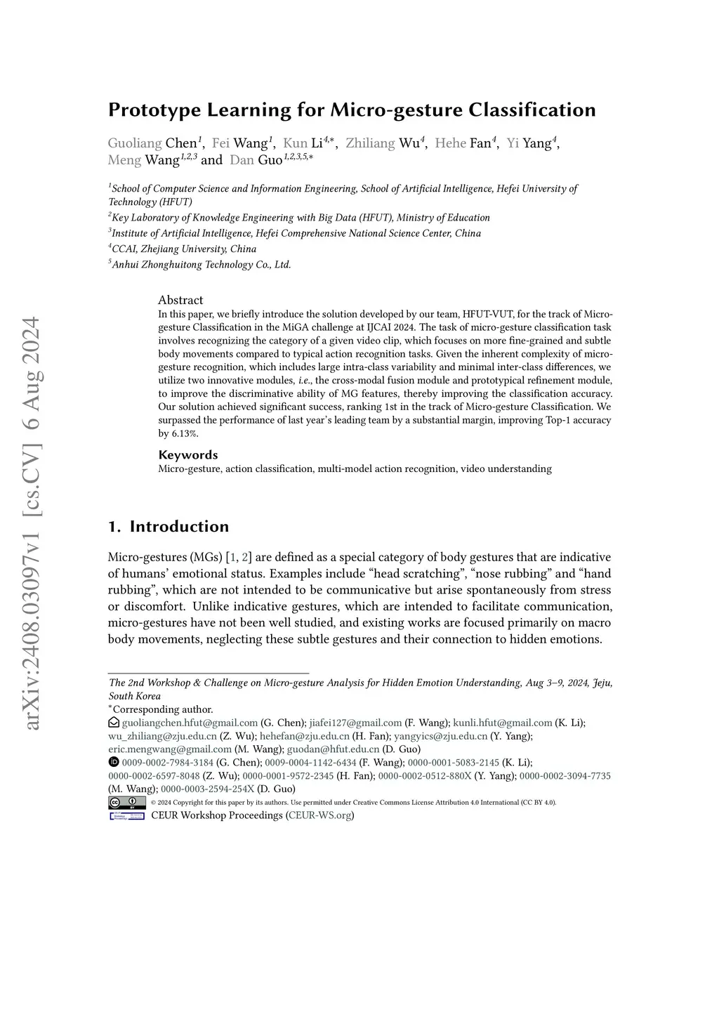 In this paper, we briefly introduce the solution developed by our team, HFUT-VUT, for the track of Micro-gesture Classification in the MiGA challenge at IJCAI 2024. The task of micro-gesture classification task involves recognizing the category of a given video clip, which focuses on more fine-grained and subtle body movements compared to typical action recognition tasks. Given the inherent complexity of micro-gesture recognition, which includes large intra-class variability and minimal inter-class differences, we utilize two innovative modules, i.e., the cross-modal fusion module and prototypical refinement module, to improve the discriminative ability of MG features, thereby improving the classification accuracy. Our solution achieved significant success, ranking 1st in the track of Micro-gesture Classification. We surpassed the performance of last year's leading team by a substantial margin, improving Top-1 accuracy by 6.13%.