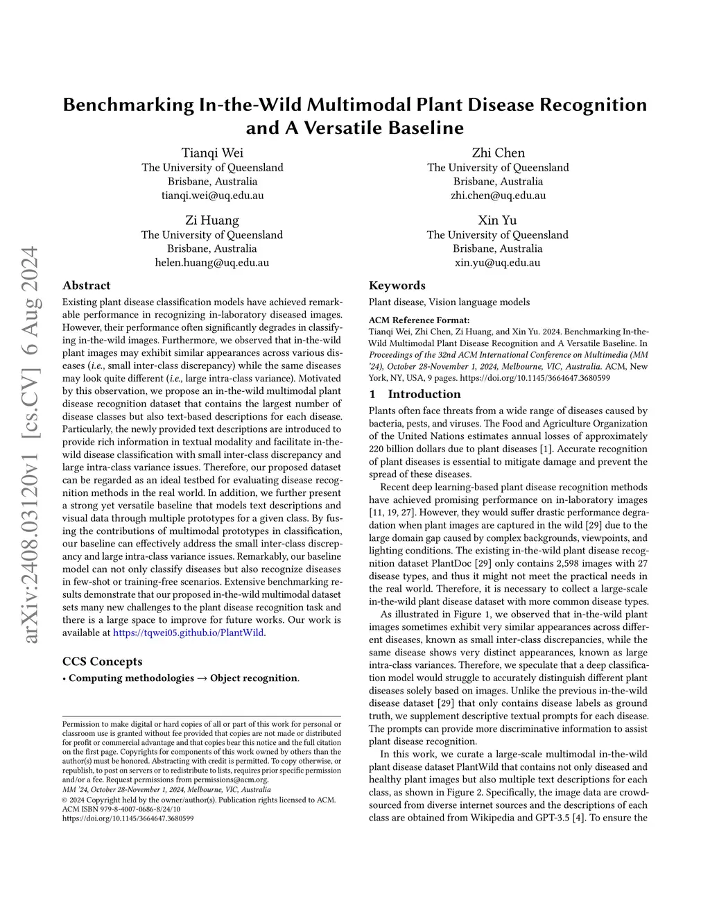 Existing plant disease classification models have achieved remarkable performance in recognizing in-laboratory diseased images. However, their performance often significantly degrades in classifying in-the-wild images. Furthermore, we observed that in-the-wild plant images may exhibit similar appearances across various diseases (i.e., small inter-class discrepancy) while the same diseases may look quite different (i.e., large intra-class variance). Motivated by this observation, we propose an in-the-wild multimodal plant disease recognition dataset that contains the largest number of disease classes but also text-based descriptions for each disease. Particularly, the newly provided text descriptions are introduced to provide rich information in textual modality and facilitate in-the-wild disease classification with small inter-class discrepancy and large intra-class variance issues. Therefore, our proposed dataset can be regarded as an ideal testbed for evaluating disease recognition methods in the real world. In addition, we further present a strong yet versatile baseline that models text descriptions and visual data through multiple prototypes for a given class. By fusing the contributions of multimodal prototypes in classification, our baseline can effectively address the small inter-class discrepancy and large intra-class variance issues. Remarkably, our baseline model can not only classify diseases but also recognize diseases in few-shot or training-free scenarios. Extensive benchmarking results demonstrate that our proposed in-the-wild multimodal dataset sets many new challenges to the plant disease recognition task and there is a large space to improve for future works.