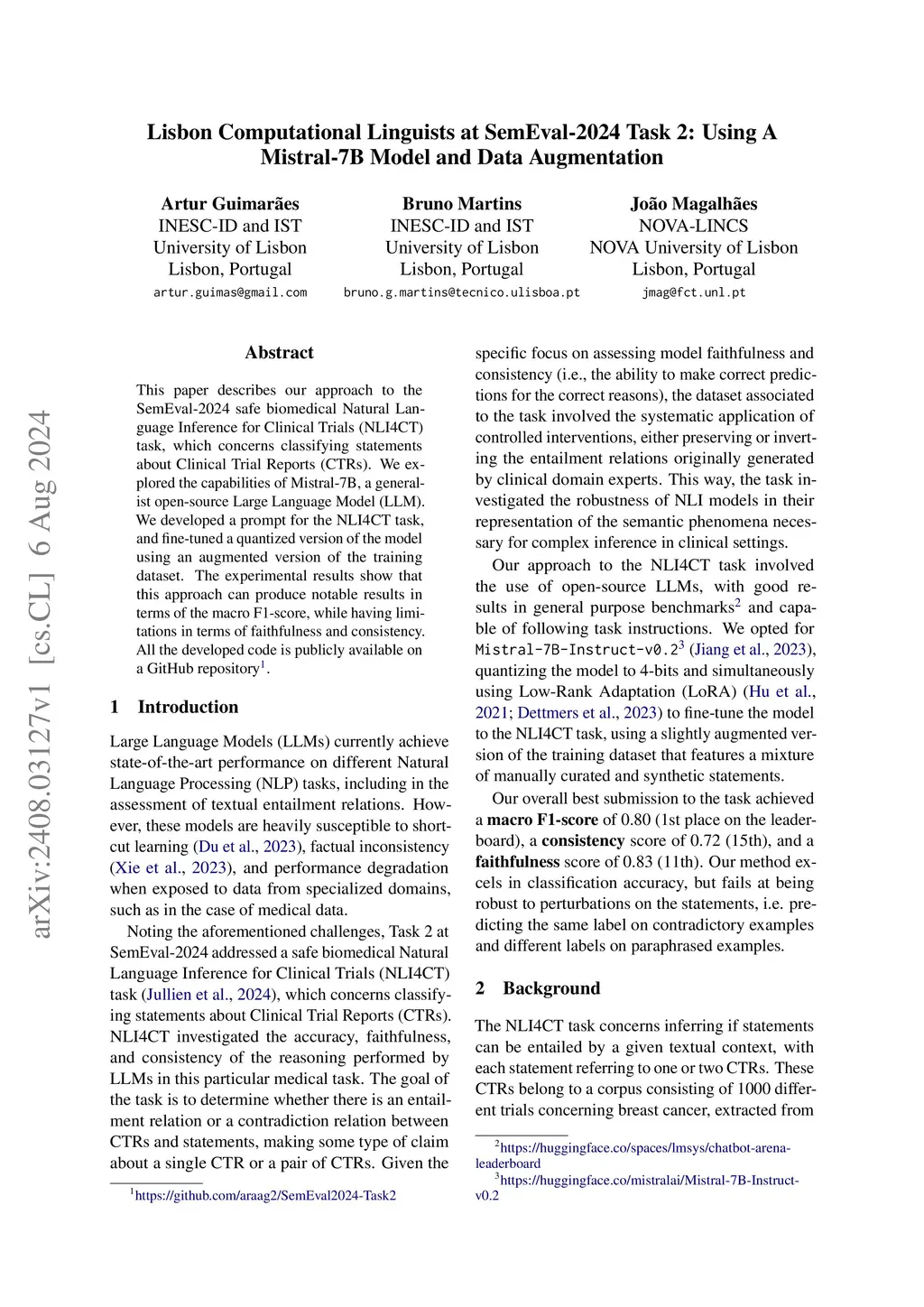Lisbon Computational Linguists at SemEval-2024 Task 2: Using A Mistral
