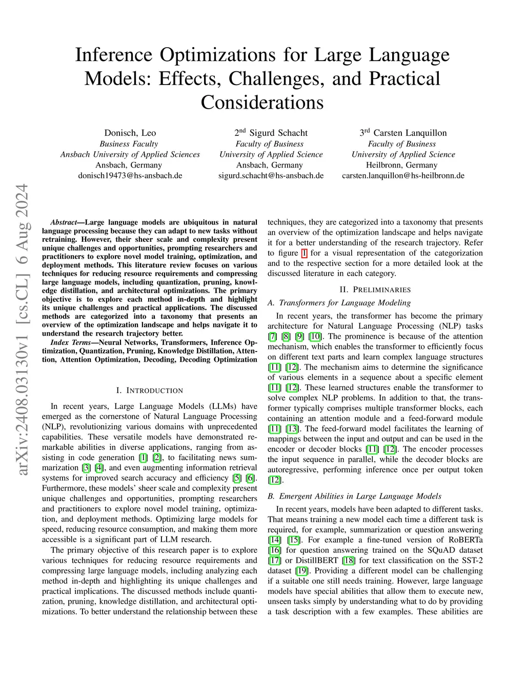 Large language models are ubiquitous in natural language processing because they can adapt to new tasks without retraining. However, their sheer scale and complexity present unique challenges and opportunities, prompting researchers and practitioners to explore novel model training, optimization, and deployment methods. This literature review focuses on various techniques for reducing resource requirements and compressing large language models, including quantization, pruning, knowledge distillation, and architectural optimizations. The primary objective is to explore each method in-depth and highlight its unique challenges and practical applications. The discussed methods are categorized into a taxonomy that presents an overview of the optimization landscape and helps navigate it to understand the research trajectory better.