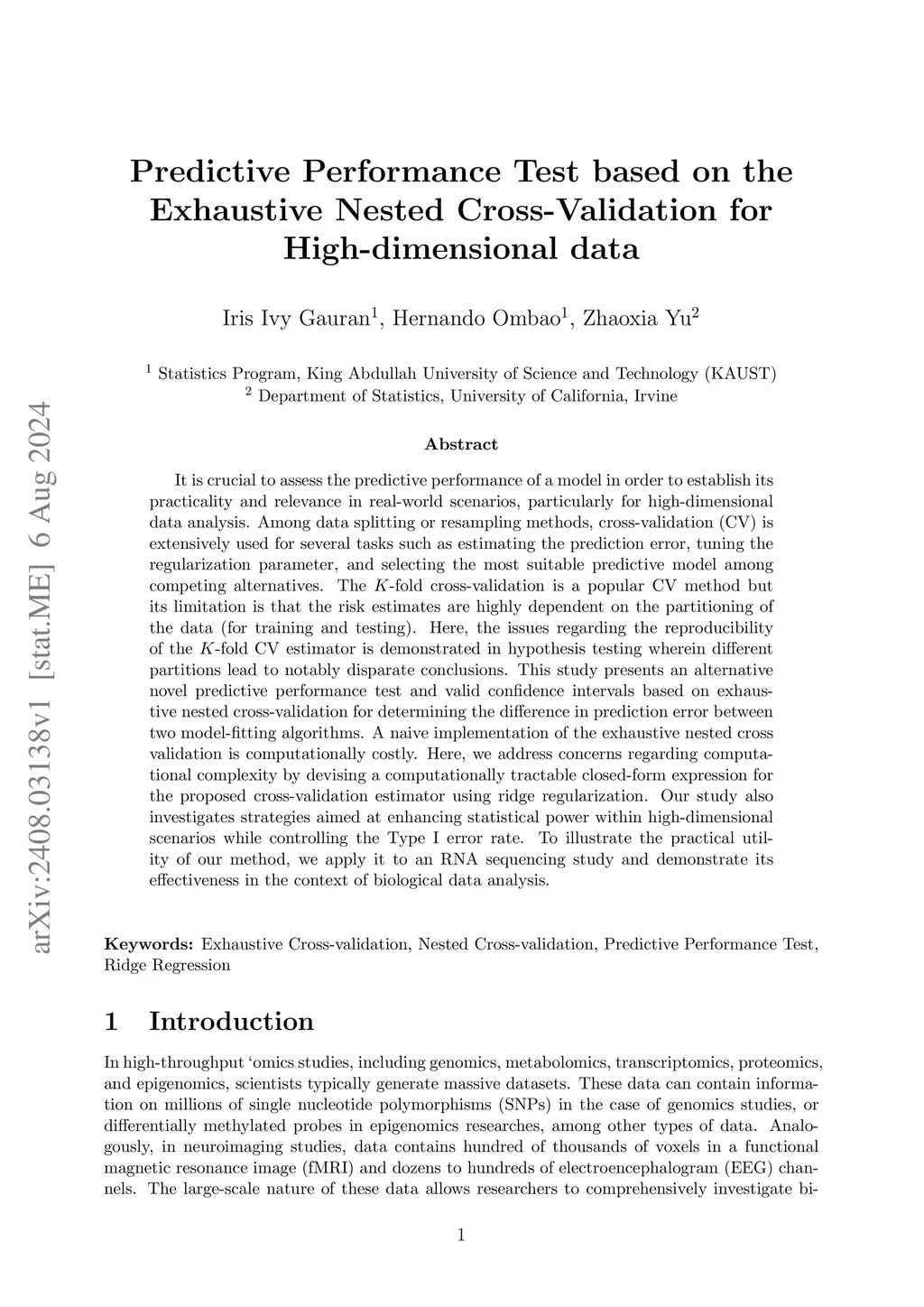 It is crucial to assess the predictive performance of a model to establish its practicality and relevance in real-world scenarios, particularly for high-dimensional data analysis. Among data splitting or resampling methods, cross-validation (CV) is extensively used for several tasks such as estimating the prediction error, tuning the regularization parameter, and selecting the most suitable predictive model among competing alternatives. The -fold cross-validation is a popular CV method but its limitation is that the risk estimates are highly dependent on the partitioning of the data (for training and testing). Here, the issues regarding the reproducibility of the -fold CV estimator are demonstrated in hypothesis testing wherein different partitions lead to notably disparate conclusions. This study presents a novel predictive performance test and valid confidence intervals based on exhaustive nested cross-validation for determining the difference in prediction error between two model-fitting algorithms. A naive implementation of the exhaustive nested cross-validation is computationally costly. Here, we address concerns regarding computational complexity by devising a computationally tractable closed-form expression for the proposed cross-validation estimator. Our study also investigates strategies aimed at enhancing statistical power within high-dimensional scenarios while controlling the Type I error rate. \tr{Through comprehensive numerical experiments, we demonstrate that Ridge-based methods using bias to measure uncertainty of CV estimates and adaptive hyperparameter selection provide the most reliable approach for high-dimensional predictive performance testing.} To illustrate the practical utility of our method, we apply it to an RNA sequencing study and demonstrate its effectiveness in the context of biological data analysis.