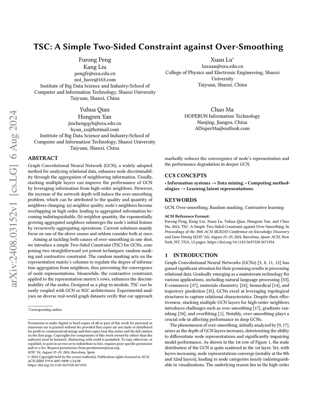 Graph Convolutional Neural Network (GCN), a widely adopted method for analyzing relational data, enhances node discriminability through the aggregation of neighboring information. Usually, stacking multiple layers can improve the performance of GCN by leveraging information from high-order neighbors. However, the increase of the network depth will induce the over-smoothing problem, which can be attributed to the quality and quantity of neighbors changing: (a) neighbor quality, node's neighbors become overlapping in high order, leading to aggregated information becoming indistinguishable, (b) neighbor quantity, the exponentially growing aggregated neighbors submerges the node's initial feature by recursively aggregating operations. Current solutions mainly focus on one of the above causes and seldom consider both at once. Aiming at tackling both causes of over-smoothing in one shot, we introduce a simple Two-Sided Constraint (TSC) for GCNs, comprising two straightforward yet potent techniques: random masking and contrastive constraint. The random masking acts on the representation matrix's columns to regulate the degree of information aggregation from neighbors, thus preventing the convergence of node representations. Meanwhile, the contrastive constraint, applied to the representation matrix's rows, enhances the discriminability of the nodes. Designed as a plug-in module, TSC can be easily coupled with GCN or SGC architectures. Experimental analyses on diverse real-world graph datasets verify that our approach markedly reduces the convergence of node's representation and the performance degradation in deeper GCN.