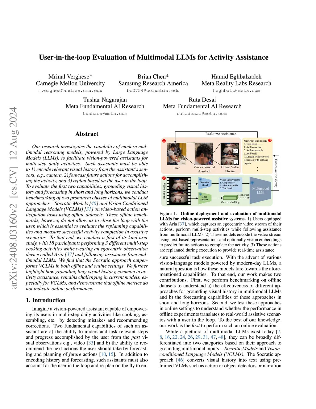 Our research investigates the capability of modern multimodal reasoning models, powered by Large Language Models (LLMs), to facilitate vision-powered assistants for multi-step daily activities. Such assistants must be able to 1) encode relevant visual history from the assistant's sensors, e.g., camera, 2) forecast future actions for accomplishing the activity, and 3) replan based on the user in the loop. To evaluate the first two capabilities, grounding visual history and forecasting in short and long horizons, we conduct benchmarking of two prominent classes of multimodal LLM approaches -- Socratic Models and Vision Conditioned Language Models (VCLMs) on video-based action anticipation tasks using offline datasets. These offline benchmarks, however, do not allow us to close the loop with the user, which is essential to evaluate the replanning capabilities and measure successful activity completion in assistive scenarios. To that end, we conduct a first-of-its-kind user study, with 18 participants performing 3 different multi-step cooking activities while wearing an egocentric observation device called Aria and following assistance from multimodal LLMs. We find that the Socratic approach outperforms VCLMs in both offline and online settings. We further highlight how grounding long visual history, common in activity assistance, remains challenging in current models, especially for VCLMs, and demonstrate that offline metrics do not indicate online performance.