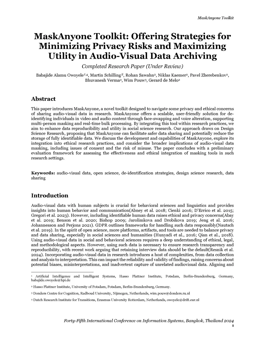 This paper introduces MaskAnyone, a novel toolkit designed to navigate some privacy and ethical concerns of sharing audio-visual data in research. MaskAnyone offers a scalable, user-friendly solution for de-identifying individuals in video and audio content through face-swapping and voice alteration, supporting multi-person masking and real-time bulk processing. By integrating this tool within research practices, we aim to enhance data reproducibility and utility in social science research. Our approach draws on Design Science Research, proposing that MaskAnyone can facilitate safer data sharing and potentially reduce the storage of fully identifiable data. We discuss the development and capabilities of MaskAnyone, explore its integration into ethical research practices, and consider the broader implications of audio-visual data masking, including issues of consent and the risk of misuse. The paper concludes with a preliminary evaluation framework for assessing the effectiveness and ethical integration of masking tools in such research settings.