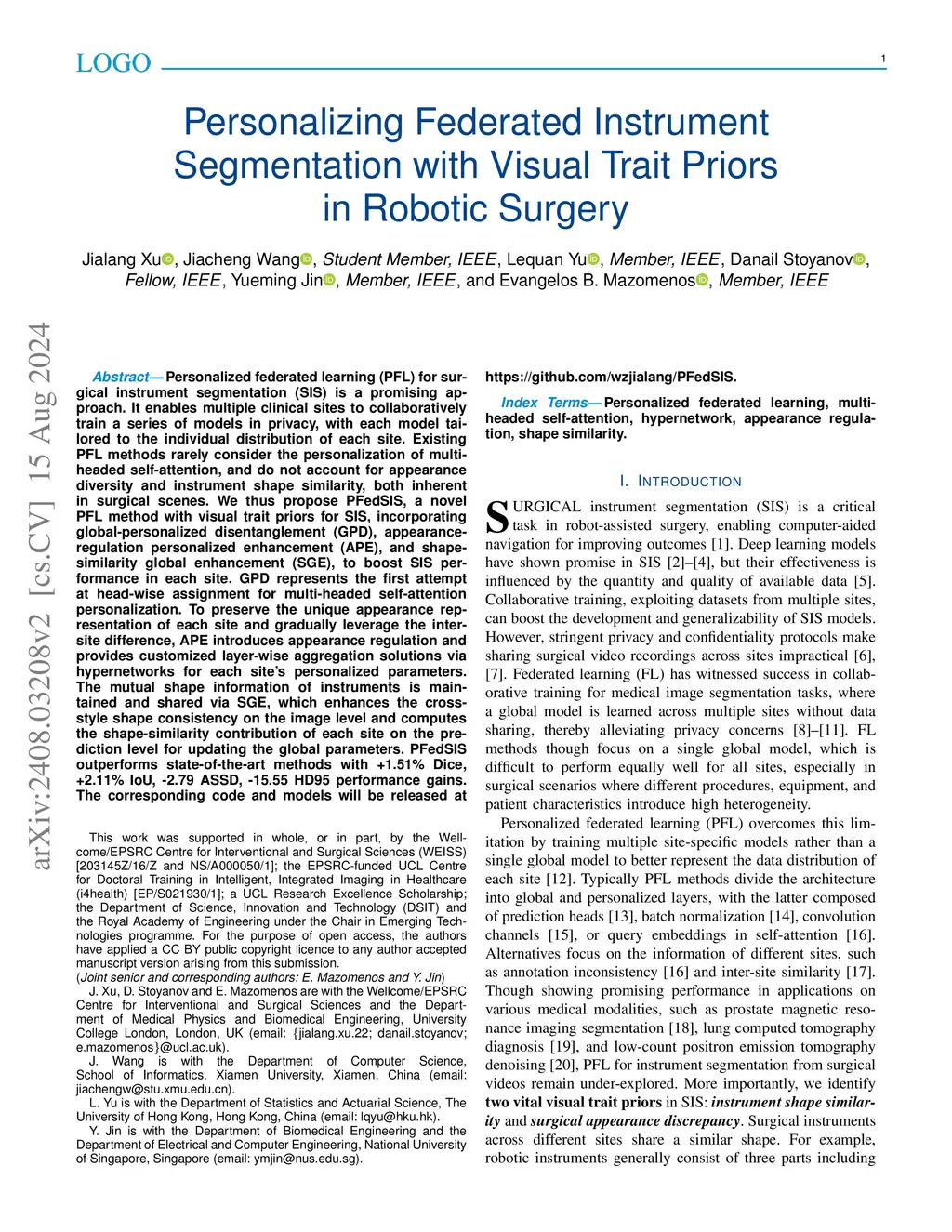 Personalized federated learning (PFL) for surgical instrument segmentation (SIS) is a promising approach. It enables multiple clinical sites to collaboratively train a series of models in privacy, with each model tailored to the individual distribution of each site. Existing PFL methods rarely consider the personalization of multi-headed self-attention, and do not account for appearance diversity and instrument shape similarity, both inherent in surgical scenes. We thus propose PFedSIS, a novel PFL method with visual trait priors for SIS, incorporating global-personalized disentanglement (GPD), appearance-regulation personalized enhancement (APE), and shape-similarity global enhancement (SGE), to boost SIS performance in each site. GPD represents the first attempt at head-wise assignment for multi-headed self-attention personalization. To preserve the unique appearance representation of each site and gradually leverage the inter-site difference, APE introduces appearance regulation and provides customized layer-wise aggregation solutions via hypernetworks for each site's personalized parameters. The mutual shape information of instruments is maintained and shared via SGE, which enhances the cross-style shape consistency on the image level and computes the shape-similarity contribution of each site on the prediction level for updating the global parameters. PFedSIS outperforms state-of-the-art methods with +1.51% Dice, +2.11% IoU, -2.79 ASSD, -15.55 HD95 performance gains. The corresponding code and models will be released at https://github.com/wzjialang/PFedSIS.