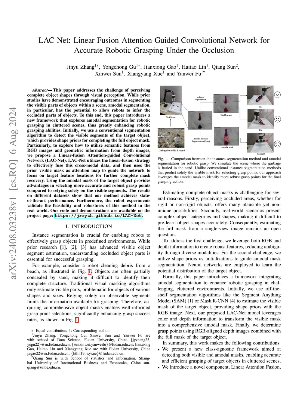 This paper addresses the challenge of perceiving complete object shapes through visual perception. While prior studies have demonstrated encouraging outcomes in segmenting the visible parts of objects within a scene, amodal segmentation, in particular, has the potential to allow robots to infer the occluded parts of objects. To this end, this paper introduces a new framework that explores amodal segmentation for robotic grasping in cluttered scenes, thus greatly enhancing robotic grasping abilities. Initially, we use a conventional segmentation algorithm to detect the visible segments of the target object, which provides shape priors for completing the full object mask. Particularly, to explore how to utilize semantic features from RGB images and geometric information from depth images, we propose a Linear-fusion Attention-guided Convolutional Network (LAC-Net). LAC-Net utilizes the linear-fusion strategy to effectively fuse this cross-modal data, and then uses the prior visible mask as attention map to guide the network to focus on target feature locations for further complete mask recovery. Using the amodal mask of the target object provides advantages in selecting more accurate and robust grasp points compared to relying solely on the visible segments. The results on different datasets show that our method achieves state-of-the-art performance. Furthermore, the robot experiments validate the feasibility and robustness of this method in the real world. Our code and demonstrations are available on the project page: https://jrryzh.github.io/LAC-Net.