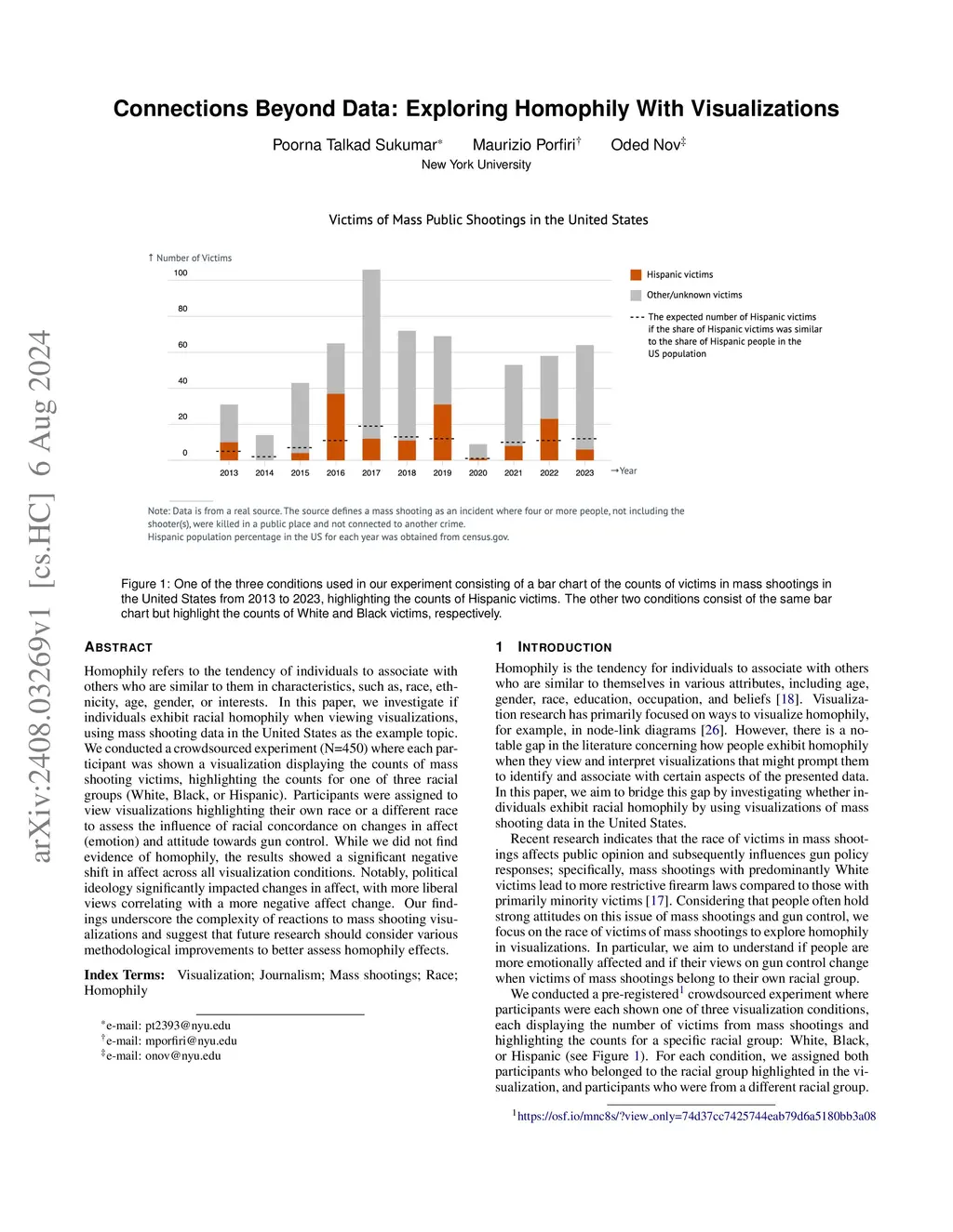 Homophily refers to the tendency of individuals to associate with others who are similar to them in characteristics, such as, race, ethnicity, age, gender, or interests. In this paper, we investigate if individuals exhibit racial homophily when viewing visualizations, using mass shooting data in the United States as the example topic. We conducted a crowdsourced experiment (N=450) where each participant was shown a visualization displaying the counts of mass shooting victims, highlighting the counts for one of three racial groups (White, Black, or Hispanic). Participants were assigned to view visualizations highlighting their own race or a different race to assess the influence of racial concordance on changes in affect (emotion) and attitude towards gun control. While we did not find evidence of homophily, the results showed a significant negative shift in affect across all visualization conditions. Notably, political ideology significantly impacted changes in affect, with more liberal views correlating with a more negative affect change. Our findings underscore the complexity of reactions to mass shooting visualizations and suggest that future research should consider various methodological improvements to better assess homophily effects.