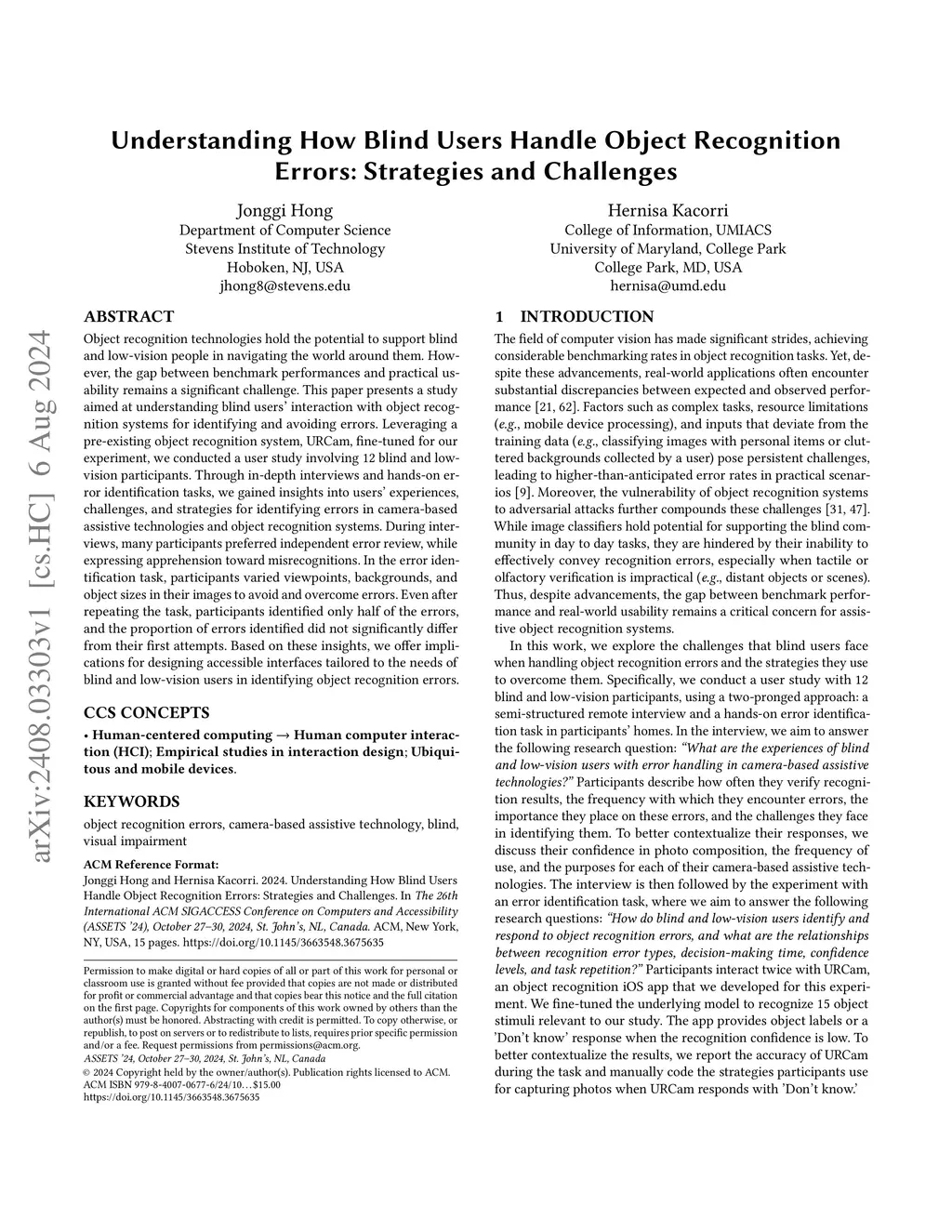 Object recognition technologies hold the potential to support blind and low-vision people in navigating the world around them. However, the gap between benchmark performances and practical usability remains a significant challenge. This paper presents a study aimed at understanding blind users' interaction with object recognition systems for identifying and avoiding errors. Leveraging a pre-existing object recognition system, URCam, fine-tuned for our experiment, we conducted a user study involving 12 blind and low-vision participants. Through in-depth interviews and hands-on error identification tasks, we gained insights into users' experiences, challenges, and strategies for identifying errors in camera-based assistive technologies and object recognition systems. During interviews, many participants preferred independent error review, while expressing apprehension toward misrecognitions. In the error identification task, participants varied viewpoints, backgrounds, and object sizes in their images to avoid and overcome errors. Even after repeating the task, participants identified only half of the errors, and the proportion of errors identified did not significantly differ from their first attempts. Based on these insights, we offer implications for designing accessible interfaces tailored to the needs of blind and low-vision users in identifying object recognition errors.