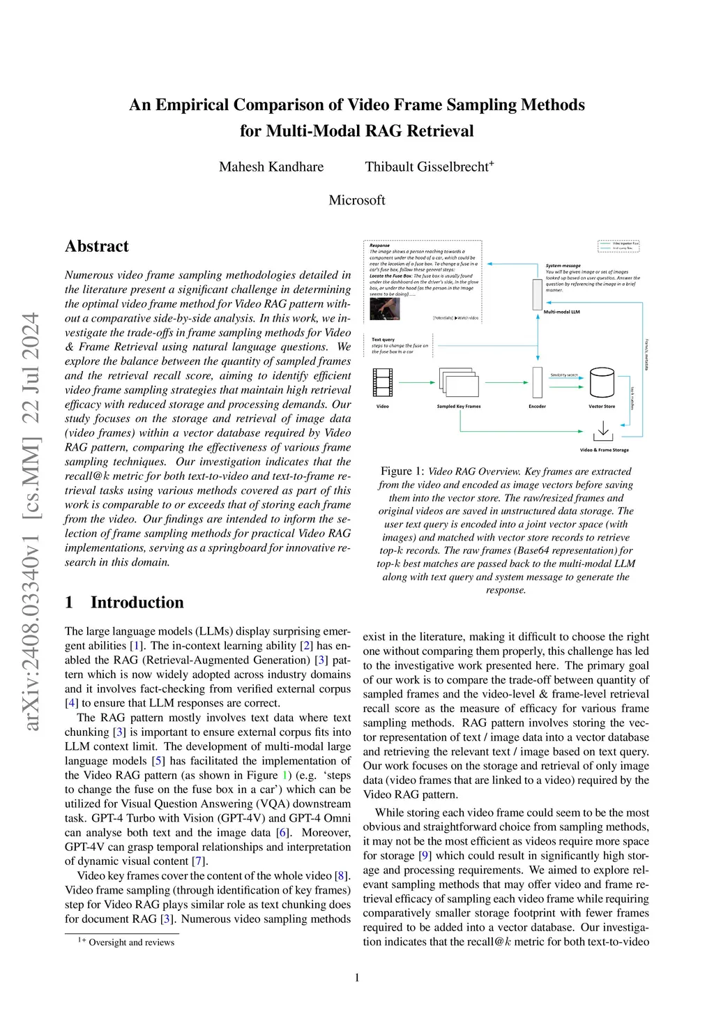 Numerous video frame sampling methodologies detailed in the literature present a significant challenge in determining the optimal video frame method for Video RAG pattern without a comparative side-by-side analysis. In this work, we investigate the trade-offs in frame sampling methods for Video & Frame Retrieval using natural language questions. We explore the balance between the quantity of sampled frames and the retrieval recall score, aiming to identify efficient video frame sampling strategies that maintain high retrieval efficacy with reduced storage and processing demands. Our study focuses on the storage and retrieval of image data (video frames) within a vector database required by Video RAG pattern, comparing the effectiveness of various frame sampling techniques. Our investigation indicates that the recall@k metric for both text-to-video and text-to-frame retrieval tasks using various methods covered as part of this work is comparable to or exceeds that of storing each frame from the video. Our findings are intended to inform the selection of frame sampling methods for practical Video RAG implementations, serving as a springboard for innovative research in this domain.