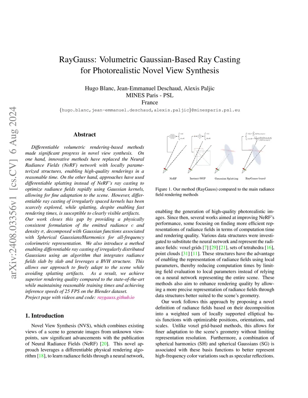 Differentiable volumetric rendering-based methods made significant progress in novel view synthesis. On one hand, innovative methods have replaced the Neural Radiance Fields (NeRF) network with locally parameterized structures, enabling high-quality renderings in a reasonable time. On the other hand, approaches have used differentiable splatting instead of NeRF's ray casting to optimize radiance fields rapidly using Gaussian kernels, allowing for fine adaptation to the scene. However, differentiable ray casting of irregularly spaced kernels has been scarcely explored, while splatting, despite enabling fast rendering times, is susceptible to clearly visible artifacts.Our work closes this gap by providing a physically consistent formulation of the emitted radiance c and density {\sigma}, decomposed with Gaussian functions associated with Spherical Gaussians/Harmonics for all-frequency colorimetric representation. We also introduce a method enabling differentiable ray casting of irregularly distributed Gaussians using an algorithm that integrates radiance fields slab by slab and leverages a BVH structure. This allows our approach to finely adapt to the scene while avoiding splatting artifacts. As a result, we achieve superior rendering quality compared to the state-of-the-art while maintaining reasonable training times and achieving inference speeds of 25 FPS on the Blender dataset. Project page with videos and code:this https URL