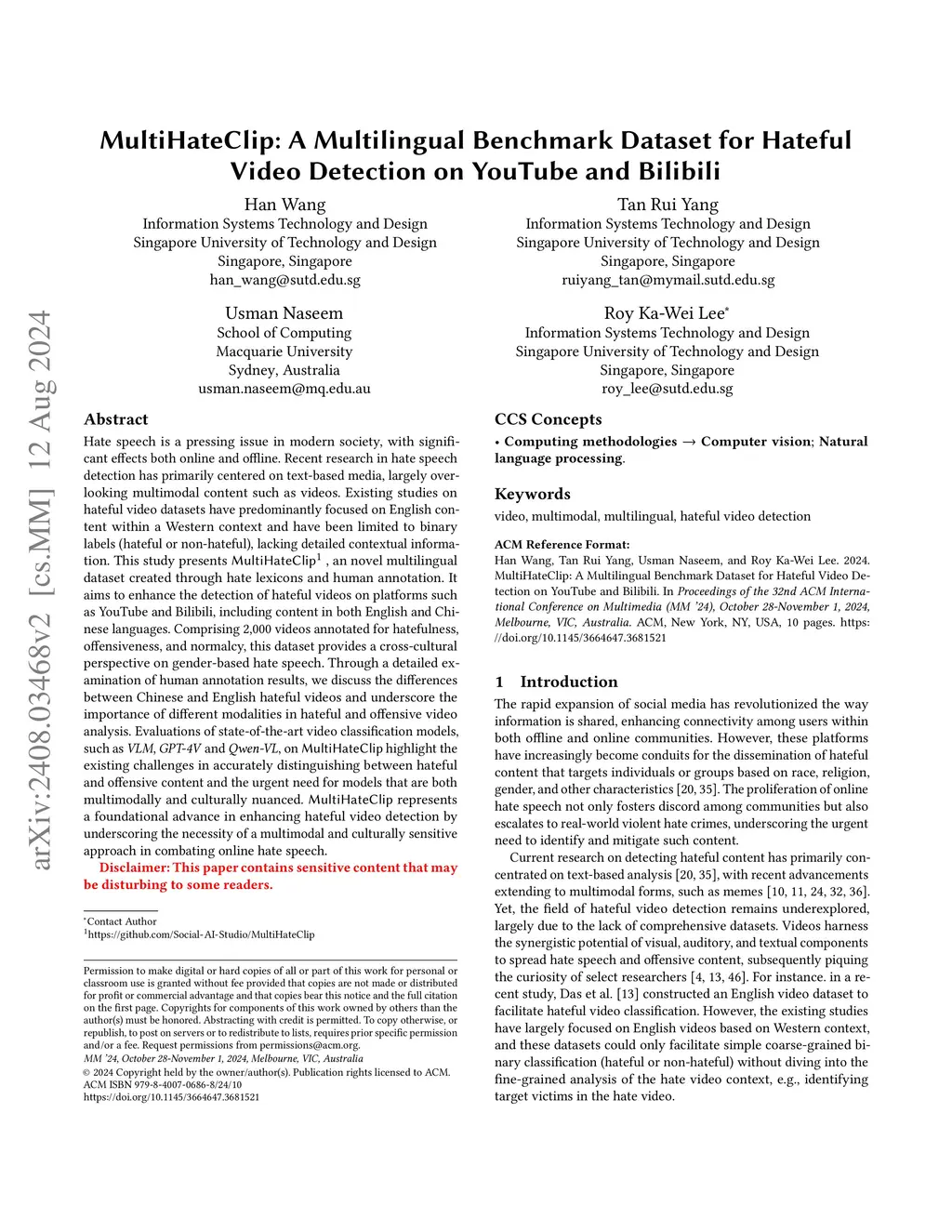 Hate speech is a pressing issue in modern society, with significant effects both online and offline. Recent research in hate speech detection has primarily centered on text-based media, largely overlooking multimodal content such as videos. Existing studies on hateful video datasets have predominantly focused on English content within a Western context and have been limited to binary labels (hateful or non-hateful), lacking detailed contextual information. This study presents MultiHateClip1 , an novel multilingual dataset created through hate lexicons and human annotation. It aims to enhance the detection of hateful videos on platforms such as YouTube and Bilibili, including content in both English and Chinese languages. Comprising 2,000 videos annotated for hatefulness, offensiveness, and normalcy, this dataset provides a cross-cultural perspective on gender-based hate speech. Through a detailed examination of human annotation results, we discuss the differences between Chinese and English hateful videos and underscore the importance of different modalities in hateful and offensive video analysis. Evaluations of state-of-the-art video classification models, such as VLM, GPT-4V and Qwen-VL, on MultiHateClip highlight the existing challenges in accurately distinguishing between hateful and offensive content and the urgent need for models that are both multimodally and culturally nuanced. MultiHateClip represents a foundational advance in enhancing hateful video detection by underscoring the necessity of a multimodal and culturally sensitive approach in combating online hate speech.