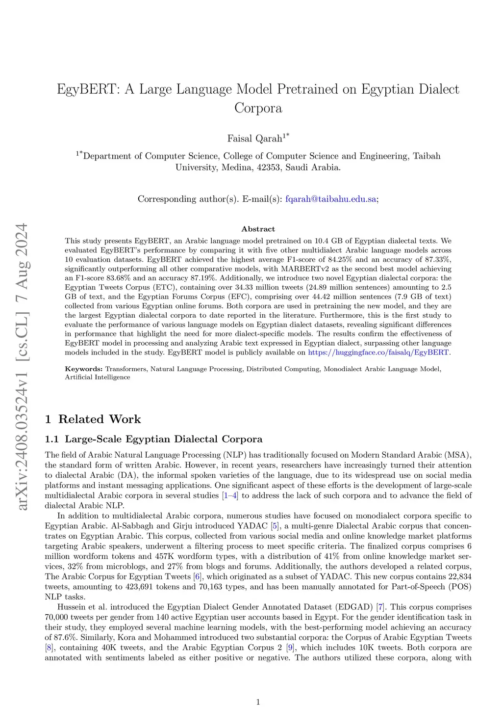 EgyBERT: A Large Language Model Pretrained on Egyptian Dialect Corpora