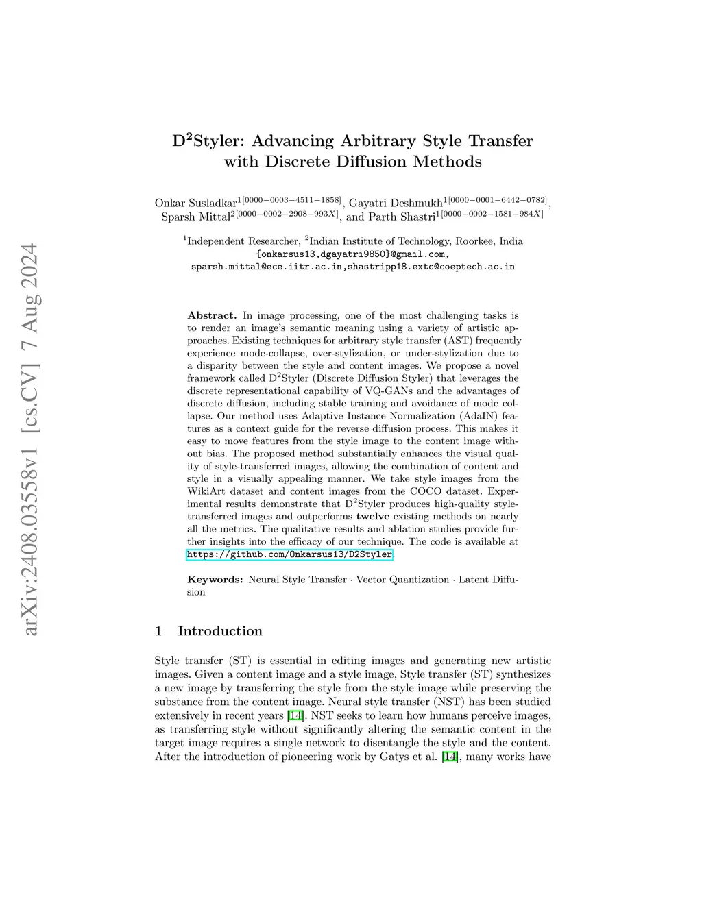 In image processing, one of the most challenging tasks is to render an image's semantic meaning using a variety of artistic approaches. Existing techniques for arbitrary style transfer (AST) frequently experience mode-collapse, over-stylization, or under-stylization due to a disparity between the style and content images. We propose a novel framework called DStyler (Discrete Diffusion Styler) that leverages the discrete representational capability of VQ-GANs and the advantages of discrete diffusion, including stable training and avoidance of mode collapse. Our method uses Adaptive Instance Normalization (AdaIN) features as a context guide for the reverse diffusion process. This makes it easy to move features from the style image to the content image without bias. The proposed method substantially enhances the visual quality of style-transferred images, allowing the combination of content and style in a visually appealing manner. We take style images from the WikiArt dataset and content images from the COCO dataset. Experimental results demonstrate that DStyler produces high-quality style-transferred images and outperforms twelve existing methods on nearly all the metrics. The qualitative results and ablation studies provide further insights into the efficacy of our technique. The code is available at https://github.com/Onkarsus13/D2Styler.