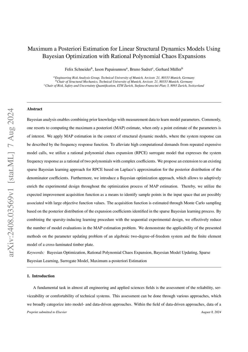 Bayesian analysis enables combining prior knowledge with measurement data to learn model parameters. Commonly, one resorts to computing the maximum a posteriori (MAP) estimate, when only a point estimate of the parameters is of interest. We apply MAP estimation in the context of structural dynamic models, where the system response can be described by the frequency response function. To alleviate high computational demands from repeated expensive model calls, we utilize a rational polynomial chaos expansion (RPCE) surrogate model that expresses the system frequency response as a rational of two polynomials with complex coefficients. We propose an extension to an existing sparse Bayesian learning approach for RPCE based on Laplace's approximation for the posterior distribution of the denominator coefficients. Furthermore, we introduce a Bayesian optimization approach, which allows to adaptively enrich the experimental design throughout the optimization process of MAP estimation. Thereby, we utilize the expected improvement acquisition function as a means to identify sample points in the input space that are possibly associated with large objective function values. The acquisition function is estimated through Monte Carlo sampling based on the posterior distribution of the expansion coefficients identified in the sparse Bayesian learning process. By combining the sparsity-inducing learning procedure with the sequential experimental design, we effectively reduce the number of model evaluations in the MAP estimation problem. We demonstrate the applicability of the presented methods on the parameter updating problem of an algebraic two-degree-of-freedom system and the finite element model of a cross-laminated timber plate.