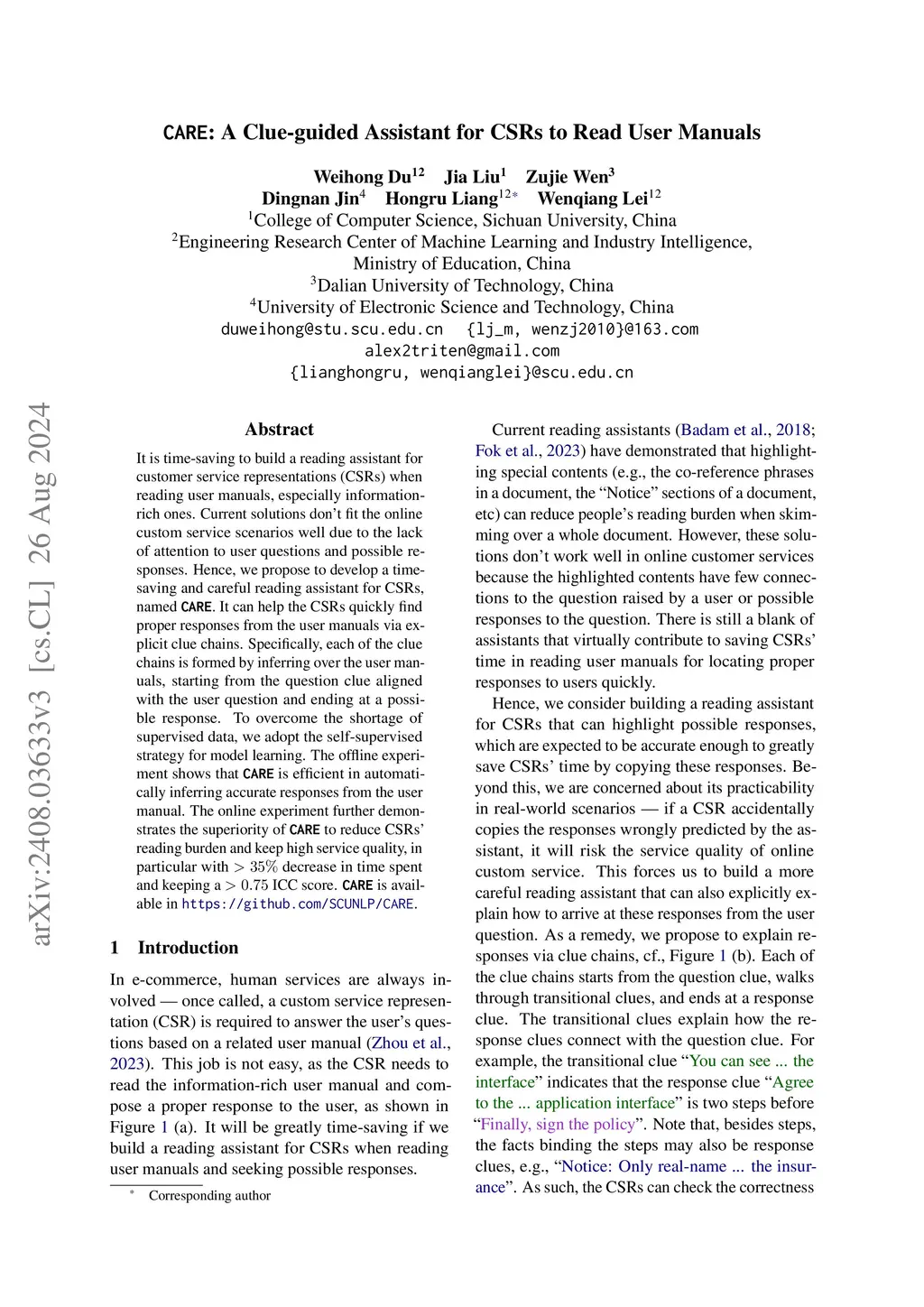 It is time-saving to build a reading assistant for customer service representations (CSRs) when reading user manuals, especially information-rich ones. Current solutions don't fit the online custom service scenarios well due to the lack of attention to user questions and possible responses. Hence, we propose to develop a time-saving and careful reading assistant for CSRs, named CARE. It can help the CSRs quickly find proper responses from the user manuals via explicit clue chains. Specifically, each of the clue chains is formed by inferring over the user manuals, starting from the question clue aligned with the user question and ending at a possible response. To overcome the shortage of supervised data, we adopt the self-supervised strategy for model learning. The offline experiment shows that CARE is efficient in automatically inferring accurate responses from the user manual. The online experiment further demonstrates the superiority of CARE to reduce CSRs' reading burden and keep high service quality, in particular with >35% decrease in time spent and keeping a >0.75 ICC score.