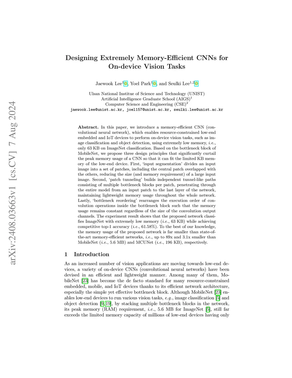 In this paper, we introduce a memory-efficient CNN (convolutional neural network), which enables resource-constrained low-end embedded and IoT devices to perform on-device vision tasks, such as image classification and object detection, using extremely low memory, i.e., only 63 KB on ImageNet classification. Based on the bottleneck block of MobileNet, we propose three design principles that significantly curtail the peak memory usage of a CNN so that it can fit the limited KB memory of the low-end device. First, ínput segmentation' divides an input image into a set of patches, including the central patch overlapped with the others, reducing the size (and memory requirement) of a large input image. Second, 'patch tunneling' builds independent tunnel-like paths consisting of multiple bottleneck blocks per patch, penetrating through the entire model from an input patch to the last layer of the network, maintaining lightweight memory usage throughout the whole network. Lastly, 'bottleneck reordering' rearranges the execution order of convolution operations inside the bottleneck block such that the memory usage remains constant regardless of the size of the convolution output channels. The experiment result shows that the proposed network classifies ImageNet with extremely low memory (i.e., 63 KB) while achieving competitive top-1 accuracy (i.e., 61.58\%). To the best of our knowledge, the memory usage of the proposed network is far smaller than state-of-the-art memory-efficient networks, i.e., up to 89x and 3.1x smaller than MobileNet (i.e., 5.6 MB) and MCUNet (i.e., 196 KB), respectively.