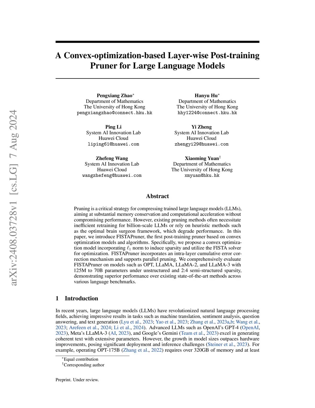 Pruning is a critical strategy for compressing trained large language models (LLMs), aiming at substantial memory conservation and computational acceleration without compromising performance. However, existing pruning methods often necessitate inefficient retraining for billion-scale LLMs or rely on heuristic methods such as the optimal brain surgeon framework, which degrade performance. In this paper, we introduce FISTAPruner, the first post-training pruner based on convex optimization models and algorithms. Specifically, we propose a convex optimization model incorporating norm to induce sparsity and utilize the FISTA solver for optimization. FISTAPruner incorporates an intra-layer cumulative error correction mechanism and supports parallel pruning. We comprehensively evaluate FISTAPruner on models such as OPT, LLaMA, LLaMA-2, and LLaMA-3 with 125M to 70B parameters under unstructured and 2:4 semi-structured sparsity, demonstrating superior performance over existing state-of-the-art methods across various language benchmarks.