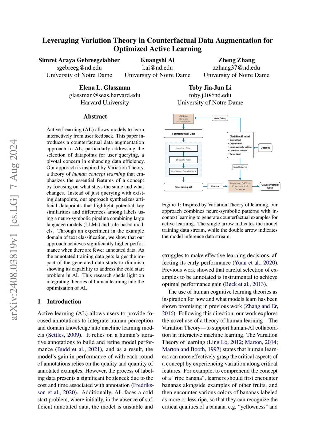 Active Learning (AL) allows models to learn interactively from user feedback. This paper introduces a counterfactual data augmentation approach to AL, particularly addressing the selection of datapoints for user querying, a pivotal concern in enhancing data efficiency. Our approach is inspired by Variation Theory, a theory of human concept learning that emphasizes the essential features of a concept by focusing on what stays the same and what changes. Instead of just querying with existing datapoints, our approach synthesizes artificial datapoints that highlight potential key similarities and differences among labels using a neuro-symbolic pipeline combining large language models (LLMs) and rule-based models. Through an experiment in the example domain of text classification, we show that our approach achieves significantly higher performance when there are fewer annotated data. As the annotated training data gets larger the impact of the generated data starts to diminish showing its capability to address the cold start problem in AL. This research sheds light on integrating theories of human learning into the optimization of AL.