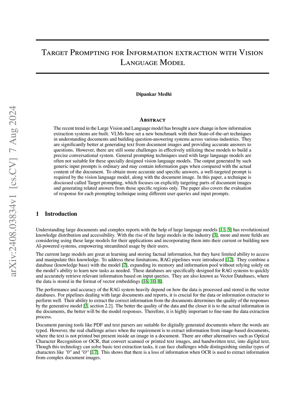 The recent trend in the Large Vision and Language model has brought a new change in how information extraction systems are built. VLMs have set a new benchmark with their State-of-the-art techniques in understanding documents and building question-answering systems across various industries. They are significantly better at generating text from document images and providing accurate answers to questions. However, there are still some challenges in effectively utilizing these models to build a precise conversational system. General prompting techniques used with large language models are often not suitable for these specially designed vision language models. The output generated by such generic input prompts is ordinary and may contain information gaps when compared with the actual content of the document. To obtain more accurate and specific answers, a well-targeted prompt is required by the vision language model, along with the document image. In this paper, a technique is discussed called Target prompting, which focuses on explicitly targeting parts of document images and generating related answers from those specific regions only. The paper also covers the evaluation of response for each prompting technique using different user queries and input prompts.