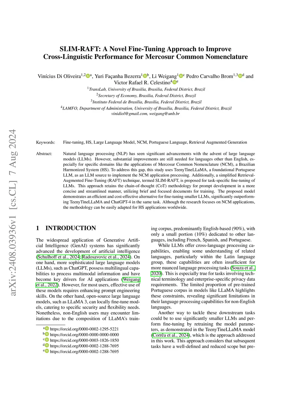 Natural language processing (NLP) has seen significant advancements with the advent of large language models (LLMs). However, substantial improvements are still needed for languages other than English, especially for specific domains like the applications of Mercosur Common Nomenclature (NCM), a Brazilian Harmonized System (HS). To address this gap, this study uses TeenyTineLLaMA, a foundational Portuguese LLM, as an LLM source to implement the NCM application processing. Additionally, a simplified Retrieval-Augmented Fine-Tuning (RAFT) technique, termed SLIM-RAFT, is proposed for task-specific fine-tuning of LLMs. This approach retains the chain-of-thought (CoT) methodology for prompt development in a more concise and streamlined manner, utilizing brief and focused documents for training. The proposed model demonstrates an efficient and cost-effective alternative for fine-tuning smaller LLMs, significantly outperforming TeenyTineLLaMA and ChatGPT-4 in the same task. Although the research focuses on NCM applications, the methodology can be easily adapted for HS applications worldwide.