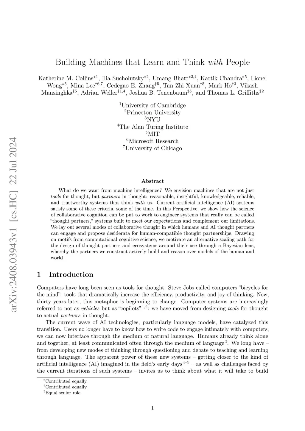 What do we want from machine intelligence? We envision machines that are not just tools for thought, but partners in thought: reasonable, insightful, knowledgeable, reliable, and trustworthy systems that think with us. Current artificial intelligence (AI) systems satisfy some of these criteria, some of the time. In this Perspective, we show how the science of collaborative cognition can be put to work to engineer systems that really can be called ``thought partners,'' systems built to meet our expectations and complement our limitations. We lay out several modes of collaborative thought in which humans and AI thought partners can engage and propose desiderata for human-compatible thought partnerships. Drawing on motifs from computational cognitive science, we motivate an alternative scaling path for the design of thought partners and ecosystems around their use through a Bayesian lens, whereby the partners we construct actively build and reason over models of the human and world.
