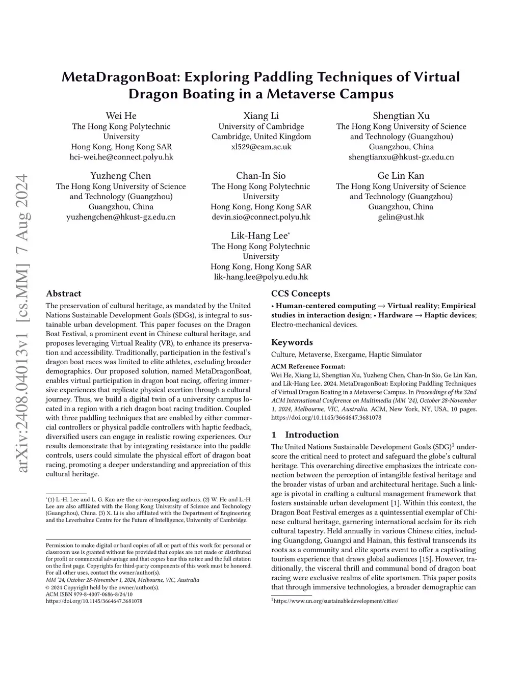 The preservation of cultural heritage, as mandated by the United Nations Sustainable Development Goals (SDGs), is integral to sustainable urban development. This paper focuses on the Dragon Boat Festival, a prominent event in Chinese cultural heritage, and proposes leveraging Virtual Reality (VR), to enhance its preservation and accessibility. Traditionally, participation in the festival's dragon boat races was limited to elite athletes, excluding broader demographics. Our proposed solution, named MetaDragonBoat, enables virtual participation in dragon boat racing, offering immersive experiences that replicate physical exertion through a cultural journey. Thus, we build a digital twin of a university campus located in a region with a rich dragon boat racing tradition. Coupled with three paddling techniques that are enabled by either commercial controllers or physical paddle controllers with haptic feedback, diversified users can engage in realistic rowing experiences. Our results demonstrate that by integrating resistance into the paddle controls, users could simulate the physical effort of dragon boat racing, promoting a deeper understanding and appreciation of this cultural heritage.