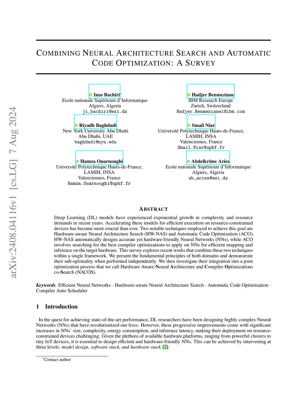 Deep Learning models have experienced exponential growth in complexity and resource demands in recent years. Accelerating these models for efficient execution on resource-constrained devices has become more crucial than ever. Two notable techniques employed to achieve this goal are Hardware-aware Neural Architecture Search (HW-NAS) and Automatic Code Optimization (ACO). HW-NAS automatically designs accurate yet hardware-friendly neural networks, while ACO involves searching for the best compiler optimizations to apply on neural networks for efficient mapping and inference on the target hardware. This survey explores recent works that combine these two techniques within a single framework. We present the fundamental principles of both domains and demonstrate their sub-optimality when performed independently. We then investigate their integration into a joint optimization process that we call Hardware Aware-Neural Architecture and Compiler Optimizations co-Search (NACOS).