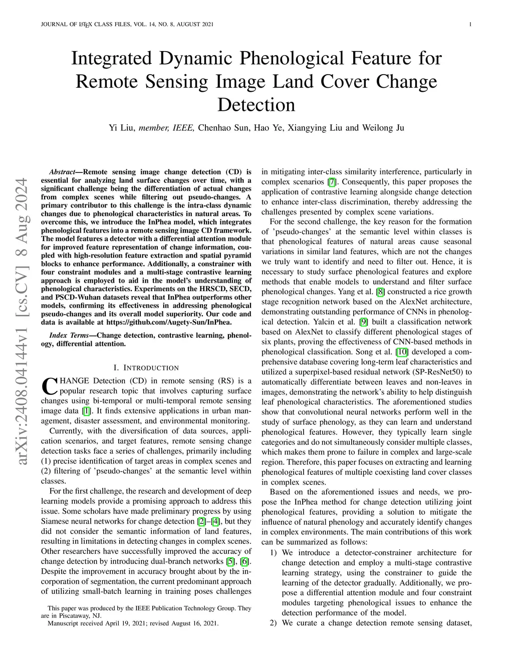 Remote sensing image change detection (CD) is essential for analyzing land surface changes over time, with a significant challenge being the differentiation of actual changes from complex scenes while filtering out pseudo-changes. A primary contributor to this challenge is the intra-class dynamic changes due to phenological characteristics in natural areas. To overcome this, we introduce the InPhea model, which integrates phenological features into a remote sensing image CD framework. The model features a detector with a differential attention module for improved feature representation of change information, coupled with high-resolution feature extraction and spatial pyramid blocks to enhance performance. Additionally, a constrainer with four constraint modules and a multi-stage contrastive learning approach is employed to aid in the model's understanding of phenological characteristics. Experiments on the HRSCD, SECD, and PSCD-Wuhan datasets reveal that InPhea outperforms other models, confirming its effectiveness in addressing phenological pseudo-changes and its overall model superiority.