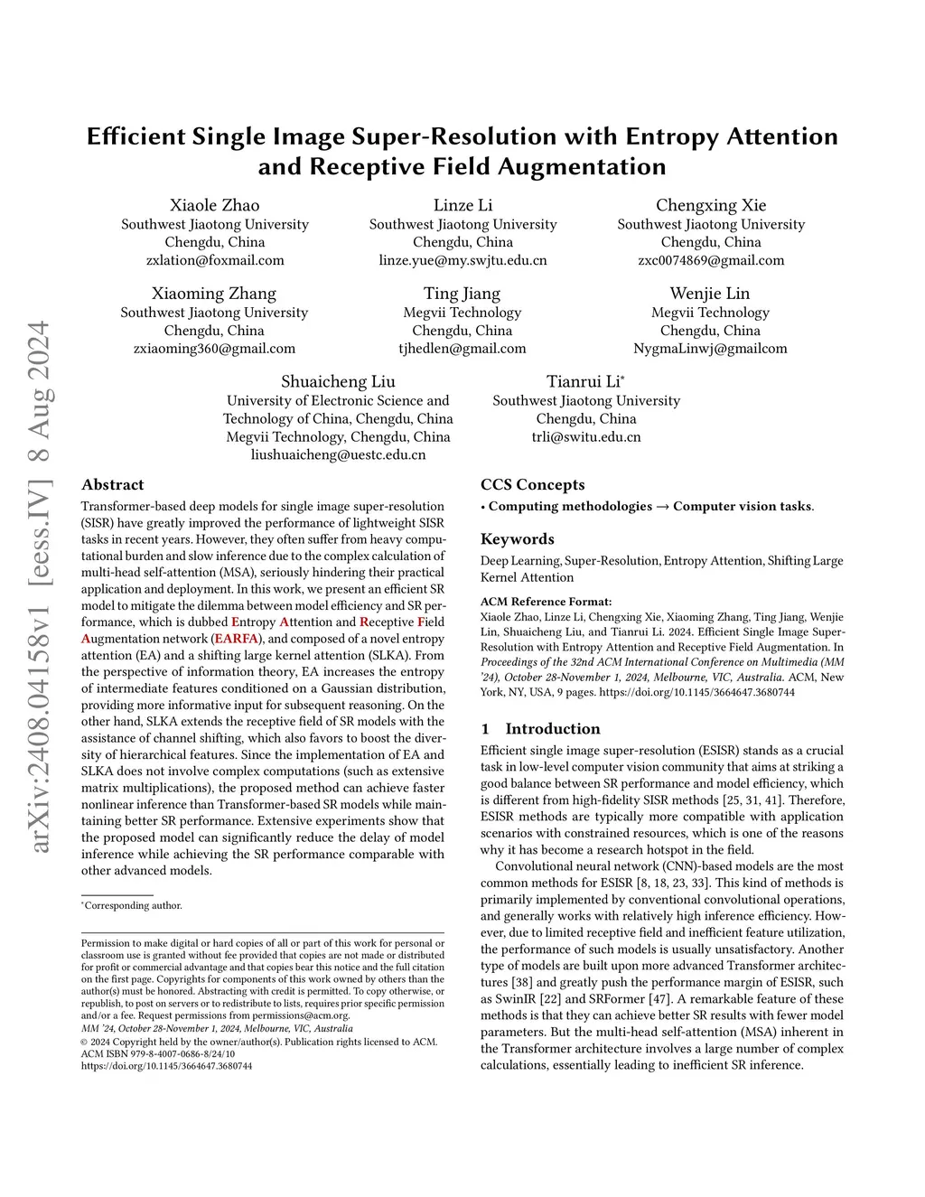 Transformer-based deep models for single image super-resolution (SISR) have greatly improved the performance of lightweight SISR tasks in recent years. However, they often suffer from heavy computational burden and slow inference due to the complex calculation of multi-head self-attention (MSA), seriously hindering their practical application and deployment. In this work, we present an efficient SR model to mitigate the dilemma between model efficiency and SR performance, which is dubbed Entropy Attention and Receptive Field Augmentation network (EARFA), and composed of a novel entropy attention (EA) and a shifting large kernel attention (SLKA). From the perspective of information theory, EA increases the entropy of intermediate features conditioned on a Gaussian distribution, providing more informative input for subsequent reasoning. On the other hand, SLKA extends the receptive field of SR models with the assistance of channel shifting, which also favors to boost the diversity of hierarchical features. Since the implementation of EA and SLKA does not involve complex computations (such as extensive matrix multiplications), the proposed method can achieve faster nonlinear inference than Transformer-based SR models while maintaining better SR performance. Extensive experiments show that the proposed model can significantly reduce the delay of model inference while achieving the SR performance comparable with other advanced models.