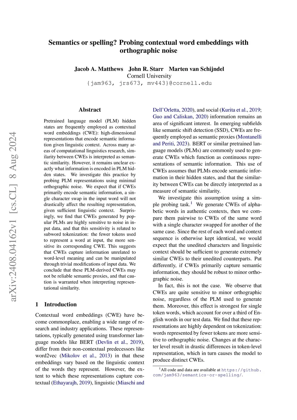 Semantics or spelling? Probing contextual word embeddings with