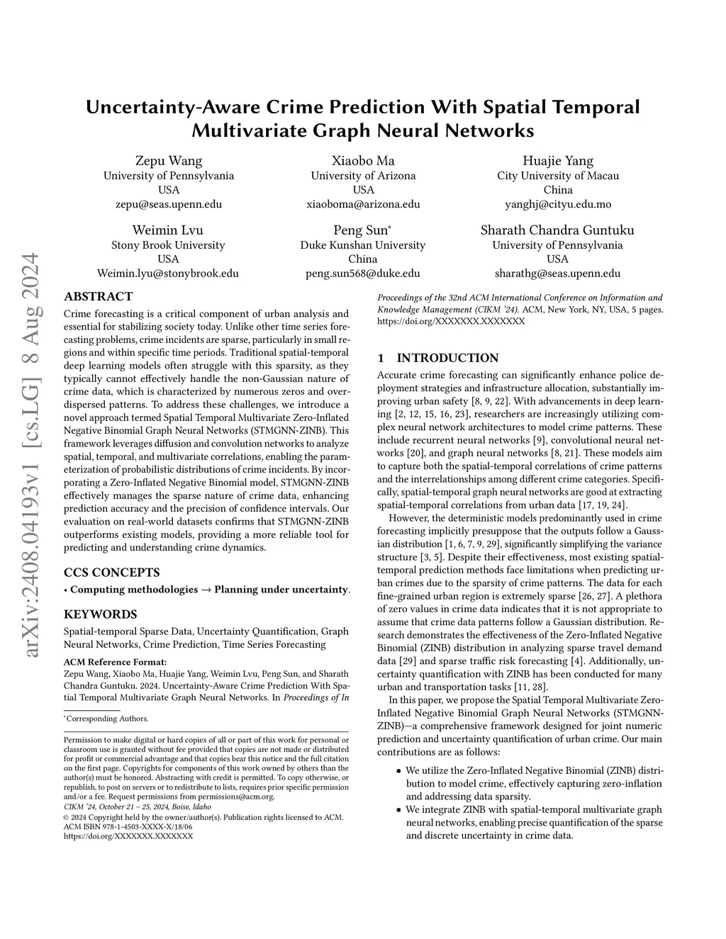 Crime forecasting is a critical component of urban analysis and essential for stabilizing society today. Unlike other time series forecasting problems, crime incidents are sparse, particularly in small regions and within specific time periods. Traditional spatial-temporal deep learning models often struggle with this sparsity, as they typically cannot effectively handle the non-Gaussian nature of crime data, which is characterized by numerous zeros and over-dispersed patterns. To address these challenges, we introduce a novel approach termed Spatial Temporal Multivariate Zero-Inflated Negative Binomial Graph Neural Networks (STMGNN-ZINB). This framework leverages diffusion and convolution networks to analyze spatial, temporal, and multivariate correlations, enabling the parameterization of probabilistic distributions of crime incidents. By incorporating a Zero-Inflated Negative Binomial model, STMGNN-ZINB effectively manages the sparse nature of crime data, enhancing prediction accuracy and the precision of confidence intervals. Our evaluation on real-world datasets confirms that STMGNN-ZINB outperforms existing models, providing a more reliable tool for predicting and understanding crime dynamics.